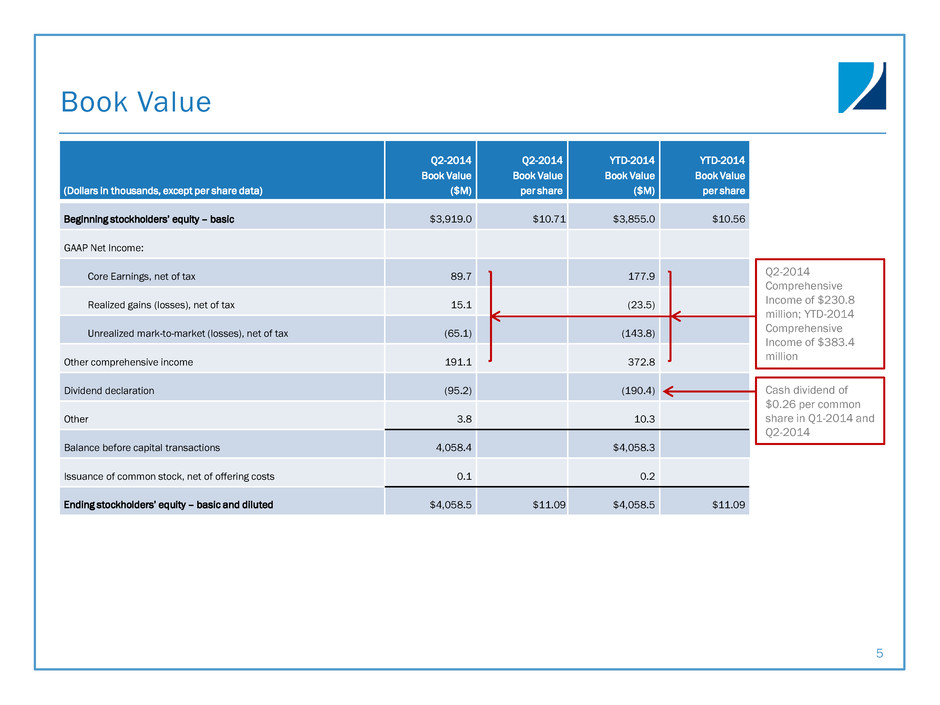 Macroeconomic & Policy Considerations M AC RO E C O NO M IC C O N S I D E R AT I O NS • Home price appreciation continues; CoreLogic Home Price Index up 7.5% on rolling 12-month basis(1) • Unemployment recovery • Low interest rates overall • Muted volatility P O L I C Y C O N S I D E R AT IO N S • End of Federal Reserve’s Quantitative Easing (QE) – Announced final reduction in asset purchases to occur after October meeting • GSE Reform – Variety of potential legislative proposals • Actively engaged with a variety of parties in Washington 4 (1) Source: CoreLogic Home Price Index rolling 12-month change as of June 30, 2014.