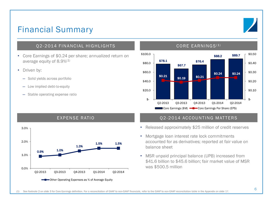 Book Value 5 (Dollars in thousands, except per share data) Q2-2014 Book Value ($M) Q2-2014 Book Value per share YTD-2014 Book Value ($M) YTD-2014 Book Value per share Beginning stockholders’ equity – basic $3,919.0 $10.71 $3,855.0 $10.56 GAAP Net Income: Core Earnings, net of tax 89.7 177.9 Realized gains (losses), net of tax 15.1 (23.5) Unrealized mark-to-market (losses), net of tax (65.1) (143.8) Other comprehensive income 191.1 372.8 Dividend declaration (95.2) (190.4) Other 3.8 10.3 Balance before capital transactions 4,058.4 $4,058.3 Issuance of common stock, net of offering costs 0.1 0.2 Ending stockholders’ equity – basic and diluted $4,058.5 $11.09 $4,058.5 $11.09 Q2-2014 Comprehensive Income of $230.8 million; YTD-2014 Comprehensive Income of $383.4 million Cash dividend of $0.26 per common share in Q1-2014 and Q2-2014