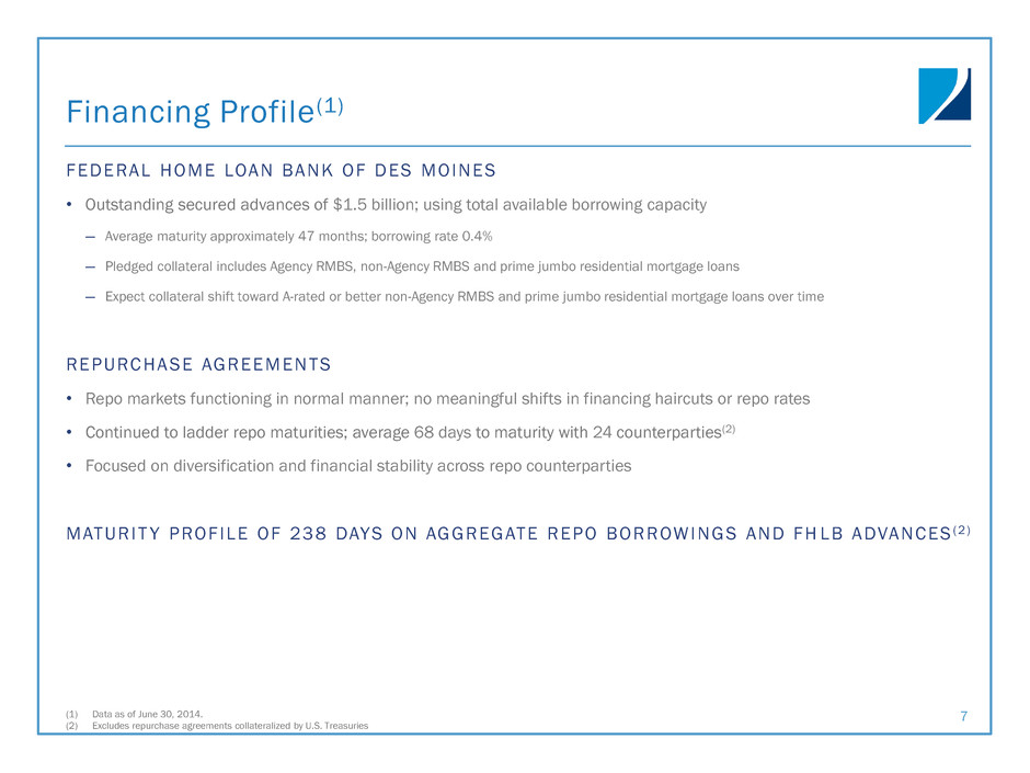 E X P E N S E R AT I O Financial Summary 6 Q 2 - 2 014 F I N A NC IAL H I G H L I G H TS C O R E E A R N I NGS (1 ) Q 2 - 2 014 AC C O U NT ING M AT T E R S (1) See footnote 2 on slide 3 for Core Earnings definition. For a reconciliation of GAAP to non-GAAP financials, refer to the GAAP to non-GAAP reconciliation table in the Appendix on slide 17. • Core Earnings of $0.24 per share; annualized return on average equity of 8.9%(1) • Driven by: ― Solid yields across portfolio ― Low implied debt-to-equity ― Stable operating expense ratio • Released approximately $25 million of credit reserves • Mortgage loan interest rate lock commitments accounted for as derivatives; reported at fair value on balance sheet • MSR unpaid principal balance (UPB) increased from $41.6 billion to $45.6 billion; fair market value of MSR was $500.5 million 0.9% 1.0% 1.3% 1.5% 1.5% 0.0% 1.0% 2.0% 3.0% Q2-2013 Q3-2013 Q4-2013 Q1-2014 Q2-2014 Other Operating Expenses as % of Average Equity $78.1 $67.7 $76.4 $88.2 $89.7 $0.21 $0.19 $0.21 $0.24 $0.24 $- $0.10 $0.20 $0.30 $0.40 $0.50 $- $20.0 $40.0 $60.0 $80.0 $100.0 Q2-2013 Q3-2013 Q4-2013 Q1-2014 Q2-2014 Core Earnings ($M) Core Earnings Per Share (EPS)