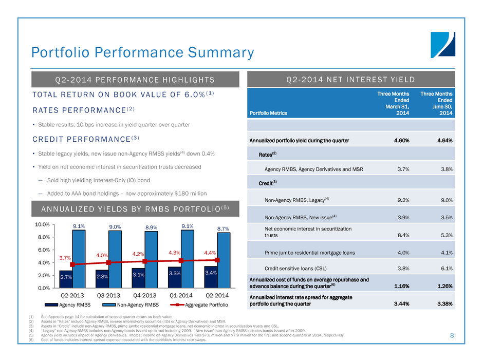 Financing Profile(1) 7 FEDERAL HOME LOAN BANK OF DES MOINES • Outstanding secured advances of $1.5 billion; using total available borrowing capacity — Average maturity approximately 47 months; borrowing rate 0.4% — Pledged collateral includes Agency RMBS, non-Agency RMBS and prime jumbo residential mortgage loans — Expect collateral shift toward A-rated or better non-Agency RMBS and prime jumbo residential mortgage loans over time REPURCHASE AGREEMENTS • Repo markets functioning in normal manner; no meaningful shifts in financing haircuts or repo rates • Continued to ladder repo maturities; average 68 days to maturity with 24 counterparties(2) • Focused on diversification and financial stability across repo counterparties MATURIT Y PROFILE OF 238 DAYS ON AGGREGATE REPO BORROWINGS AND FH LB ADVANCES (2) (1) Data as of June 30, 2014. (2) Excludes repurchase agreements collateralized by U.S. Treasuries