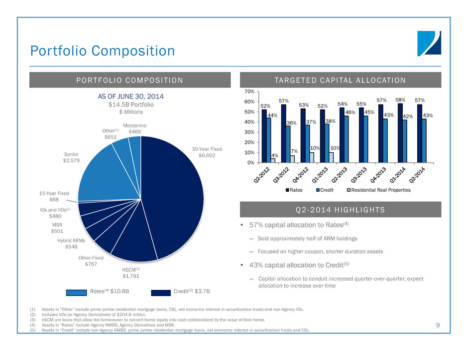 Portfolio Performance Summary 8 Q 2 - 2 014 P E R FO R M A NC E H I G H L I G H T S Q 2 - 2 014 N E T I N T E R E ST Y I E L D A N N UAL I ZE D Y I E L D S BY R M BS P O RT FO L I O (5 ) (1) See Appendix page 14 for calculation of second quarter return on book value. (2) Assets in “Rates” include Agency RMBS, inverse interest-only securities (IIOs or Agency Derivatives) and MSR. (3) Assets in “Credit” include non-Agency RMBS, prime jumbo residential mortgage loans, net economic interest in securitization trusts and CSL. (4) “Legacy” non-Agency RMBS includes non-Agency bonds issued up to and including 2009. “New issue” non-Agency RMBS includes bonds issued after 2009. (5) Agency yield includes impact of Agency Derivatives. Interest income on Agency Derivatives was $7.0 million and $7.9 million for the first and second quarters of 2014, respectively. (6) Cost of funds includes interest spread expense associated with the portfolio's interest rate swaps. TOTA L R E T U R N O N BO O K VA LU E O F 6 . 0 % (1 ) RAT E S P E RFO RM A NC E (2 ) • Stable results; 10 bps increase in yield quarter-over-quarter C R E D I T P E R FO R M A NC E (3 ) • Stable legacy yields, new issue non-Agency RMBS yields(4) down 0.4% • Yield on net economic interest in securitization trusts decreased ― Sold high yielding Interest-Only (IO) bond ― Added to AAA bond holdings – now approximately $180 million Portfolio Metrics Three Months Ended March 31, 2014 Three Months Ended June 30, 2014 Annualized portfolio yield during the quarter 4.60% 4.64% Rates(2) Agency RMBS, Agency Derivatives and MSR 3.7% 3.8% Credit(3) Non-Agency RMBS, Legacy(4) 9.2% 9.0% Non-Agency RMBS, New issue(4) 3.9% 3.5% Net economic interest in securitization trusts 8.4% 5.3% Prime jumbo residential mortgage loans 4.0% 4.1% Credit sensitive loans (CSL) 3.8% 6.1% Annualized cost of funds on average repurchase and advance balance during the quarter(6) 1.16% 1.26% Annualized interest rate spread for aggregate portfolio during the quarter 3.44% 3.38% 2.7% 2.8% 3.1% 3.3% 3.4% 9.1% 9.0% 8.9% 9.1% 8.7% 3.7% 4.0% 4.2% 4.3% 4.4% 0.0% 2.0% 4.0% 6.0% 8.0% 10.0% Q2-2013 Q3-2013 Q4-2013 Q1-2014 Q2-2014 Agency RMBS Non-Agency RMBS Aggregate Portfolio