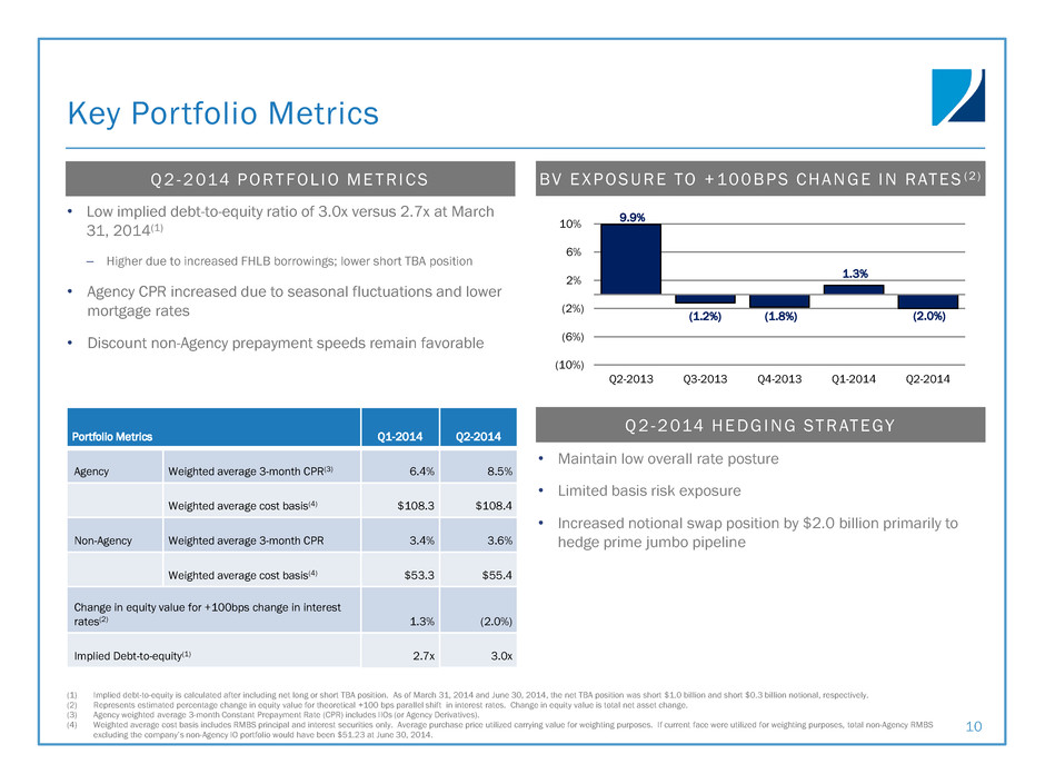 TA RG ET E D C A P I TAL A L LO C AT I O N Q 2 - 2 014 H I G H L I G H T S P O RT FO L I O C O M P O S I T I O N Portfolio Composition 9 • 57% capital allocation to Rates(4) — Sold approximately half of ARM holdings — Focused on higher coupon, shorter duration assets • 43% capital allocation to Credit(5) — Capital allocation to conduit increased quarter-over-quarter; expect allocation to increase over time Rates(4) $10.8B Credit(5) $3.7B AS OF JUNE 30, 2014 $14.5B Portfolio $ Millions (1) Assets in “Other” include prime jumbo residential mortgage loans, CSL, net economic interest in securitization trusts and non-Agency IOs. (2) Includes IIOs (or Agency Derivatives) of $204.8 million. (3) HECM are loans that allow the homeowner to convert home equity into cash collateralized by the value of their home. (4) Assets in “Rates” include Agency RMBS, Agency Derivatives and MSR. (5) Assets in “Credit” include non-Agency RMBS, prime jumbo residential mortgage loans, net economic interest in securitization trusts and CSL. 30-Year Fixed $6,602 HECM(3) $1,791 Senior $2,579 Mezzanine $469 MSR $501 Hybrid ARMs $548 15-Year Fixed $68 Other-Fixed $767 IOs and IIOs(2) $480 Other(1) $651 52% 57% 53% 52% 54% 55% 57% 58% 57% 44% 36% 37% 38% 46% 45% 43% 42% 43% 4% 7% 10% 10% 0% 10% 20% 30% 40% 50% 60% 70% Rates Credit Residential Real Properties
