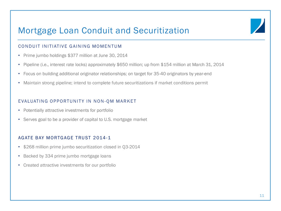 BV E X P O S U R E TO + 100BP S C H A N G E I N R AT E S (2 ) Q 2 - 2 014 H E D G I N G ST R AT E GY Q 2 - 2 014 P O RT FO L I O M E T R I C S Key Portfolio Metrics 10 • Low implied debt-to-equity ratio of 3.0x versus 2.7x at March 31, 2014(1) – Higher due to increased FHLB borrowings; lower short TBA position • Agency CPR increased due to seasonal fluctuations and lower mortgage rates • Discount non-Agency prepayment speeds remain favorable Portfolio Metrics Q1-2014 Q2-2014 Agency Weighted average 3-month CPR(3) 6.4% 8.5% Weighted average cost basis(4) $108.3 $108.4 Non-Agency Weighted average 3-month CPR 3.4% 3.6% Weighted average cost basis(4) $53.3 $55.4 Change in equity value for +100bps change in interest rates(2) 1.3% (2.0%) Implied Debt-to-equity(1) 2.7x 3.0x • Maintain low overall rate posture • Limited basis risk exposure • Increased notional swap position by $2.0 billion primarily to hedge prime jumbo pipeline (1) Implied debt-to-equity is calculated after including net long or short TBA position. As of March 31, 2014 and June 30, 2014, the net TBA position was short $1.0 billion and short $0.3 billion notional, respectively. (2) Represents estimated percentage change in equity value for theoretical +100 bps parallel shift in interest rates. Change in equity value is total net asset change. (3) Agency weighted average 3-month Constant Prepayment Rate (CPR) includes IIOs (or Agency Derivatives). (4) Weighted average cost basis includes RMBS principal and interest securities only. Average purchase price utilized carrying value for weighting purposes. If current face were utilized for weighting purposes, total non-Agency RMBS excluding the company’s non-Agency IO portfolio would have been $51.23 at June 30, 2014. 9.9% (1.2%) (1.8%) 1.3% (2.0%) (10%) (6%) (2%) 2% 6% 10% Q2-2013 Q3-2013 Q4-2013 Q1-2014 Q2-2014