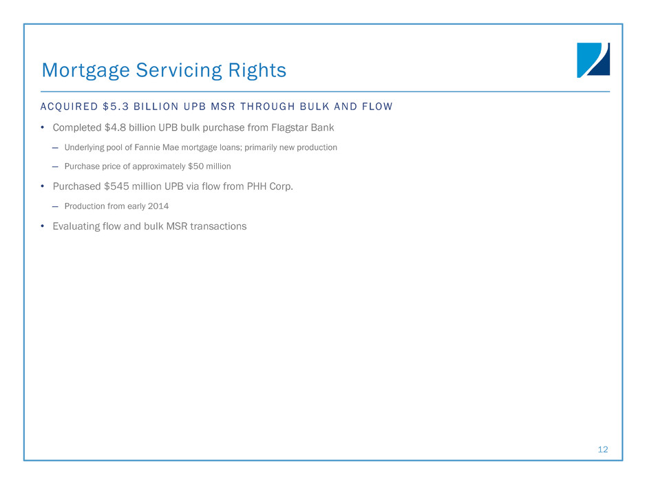 Mortgage Loan Conduit and Securitization C O N D U IT I N I T I AT IV E G A I N I NG M O M E N T U M • Prime jumbo holdings $377 million at June 30, 2014 • Pipeline (i.e., interest rate locks) approximately $650 million; up from $154 million at March 31, 2014 • Focus on building additional originator relationships; on target for 35-40 originators by year-end • Maintain strong pipeline; intend to complete future securitizations if market conditions permit E VA LUAT IN G O P P O RT U N I T Y I N N O N - Q M M A R K E T • Potentially attractive investments for portfolio • Serves goal to be a provider of capital to U.S. mortgage market AG AT E BAY M O RTG AG E T RU ST 2 014 - 1 • $268 million prime jumbo securitization closed in Q3-2014 • Backed by 334 prime jumbo mortgage loans • Created attractive investments for our portfolio 11