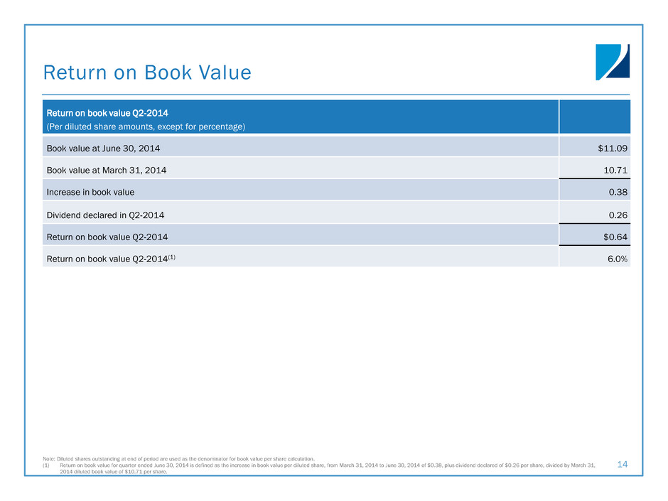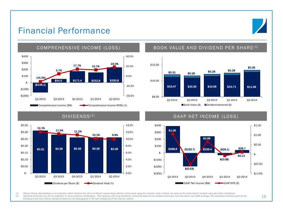 Return on Book Value 14 Return on book value Q2-2014 (Per diluted share amounts, except for percentage) Book value at June 30, 2014 $11.09 Book value at March 31, 2014 10.71 Increase in book value 0.38 Dividend declared in Q2-2014 0.26 Return on book value Q2-2014 $0.64 Return on book value Q2-2014(1) 6.0% Note: Diluted shares outstanding at end of period are used as the denominator for book value per share calculation. (1) Return on book value for quarter ended June 30, 2014 is defined as the increase in book value per diluted share, from March 31, 2014 to June 30, 2014 of $0.38, plus dividend declared of $0.26 per share, divided by March 31, 2014 diluted book value of $10.71 per share.