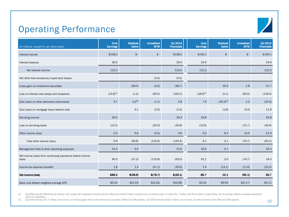 D I V I D E NDS (2 ) Financial Performance 15 C O M P R E H E N S I V E I N C O M E ( LO S S ) BO O K VA LU E A N D D I V I DE ND P E R S H A R E (1 ) G A A P N E T I N C O M E ( LO S S ) (1) Diluted shares outstanding at end of period, which includes the effect of dilutive outstanding warrants determined using the treasury stock method, are used as the denominator for book value per share calculation. (2) Historical dividends may not be indicative of future dividend distributions. The company ultimately distributes dividends based on its taxable income per common share, not GAAP earnings. The annualized dividend yield on the company’s common stock is calculated based on the closing price of the last trading day of the relevant quarter. $10.47 $10.35 $10.56 $10.71 $11.09 $0.31 $0.28 $0.26 $0.26 $0.26 $8.00 $10.00 $12.00 Q2-2013 Q3-2013 Q4-2013 Q1-2014 Q2-2014 Book Value ($) Dividend declared ($) $0.31 $0.28 $0.26 $0.26 $0.26 12.1% 11.5% 11.2% 10.1% 9.9% 0.0% 2.0% 4.0% 6.0% 8.0% 10.0% 12.0% 14.0% $- $0.05 $0.10 $0.15 $0.20 $0.25 $0.30 $0.35 Q2-2013 Q3-2013 Q4-2013 Q1-2014 Q2-2014 Dividend per Share ($) Dividend Yield (%) $388.6 ($192.7) $239.4 ($29.1) $39.7 $1.06 $(0.53) $0.66 $(0.08) $0.11 $(1.00) $(0.50) $- $0.50 $1.00 $1.50 $(300) $(200) $(100) $- $100 $200 $300 $400 Q2-2013 Q3-2013 Q4-2013 Q1-2014 Q2-2014 GAAP Net Income ($M) GAAP EPS ($) ($146.1) $54.0 $171.4 $152.6 $230.8 (14.2%) 5.7% 17.7% 15.7% 23.0% -50.0% -25.0% 0.0% 25.0% 50.0% $(200) $(100) $- $100 $200 $300 $400 Q2-2013 Q3-2013 Q4-2013 Q1-2014 Q2-2014 Comprehensive Income ($M) Comprehensive Income ROAE (%)