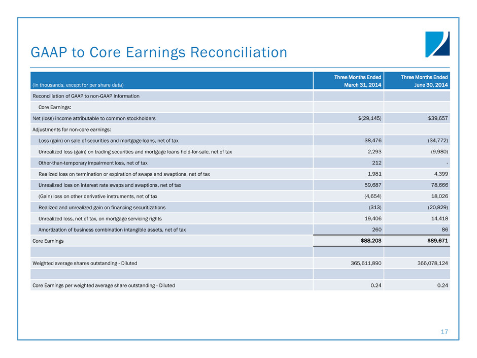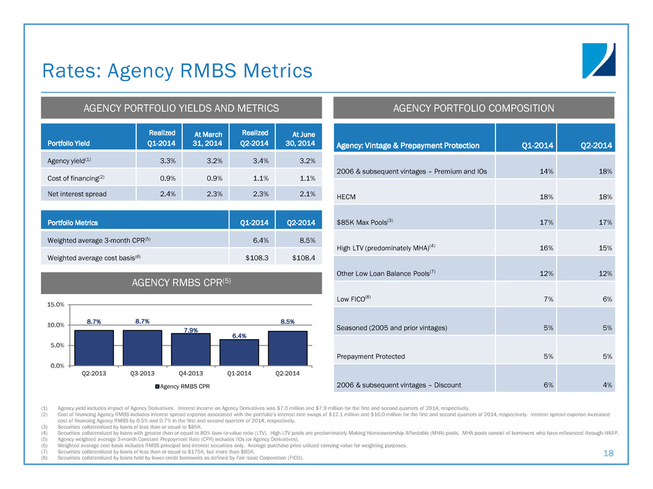 GAAP to Core Earnings Reconciliation 17 (In thousands, except for per share data) Three Months Ended March 31, 2014 Three Months Ended June 30, 2014 Reconciliation of GAAP to non-GAAP Information Core Earnings: Net (loss) income attributable to common stockholders $(29,145) $39,657 Adjustments for non-core earnings: Loss (gain) on sale of securities and mortgage loans, net of tax 38,476 (34,772) Unrealized loss (gain) on trading securities and mortgage loans held-for-sale, net of tax 2,293 (9,980) Other-than-temporary impairment loss, net of tax 212 - Realized loss on termination or expiration of swaps and swaptions, net of tax 1,981 4,399 Unrealized loss on interest rate swaps and swaptions, net of tax 59,687 78,666 (Gain) loss on other derivative instruments, net of tax (4,654) 18,026 Realized and unrealized gain on financing securitizations (313) (20,829) Unrealized loss, net of tax, on mortgage servicing rights 19,406 14,418 Amortization of business combination intangible assets, net of tax 260 86 Core Earnings $88,203 $89,671 Weighted average shares outstanding - Diluted 365,611,890 366,078,124 Core Earnings per weighted average share outstanding - Diluted 0.24 0.24