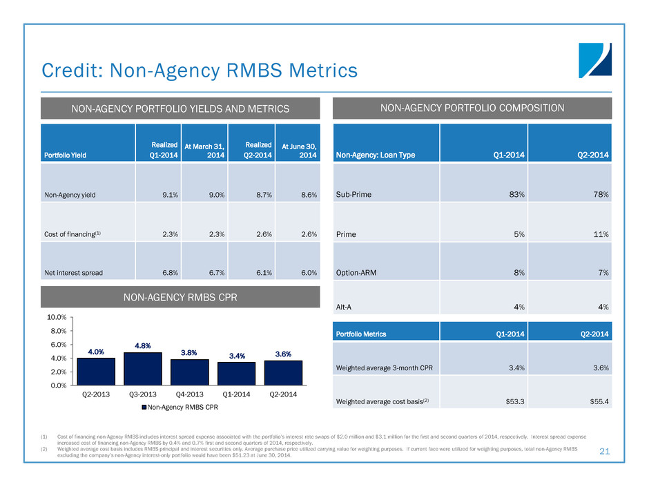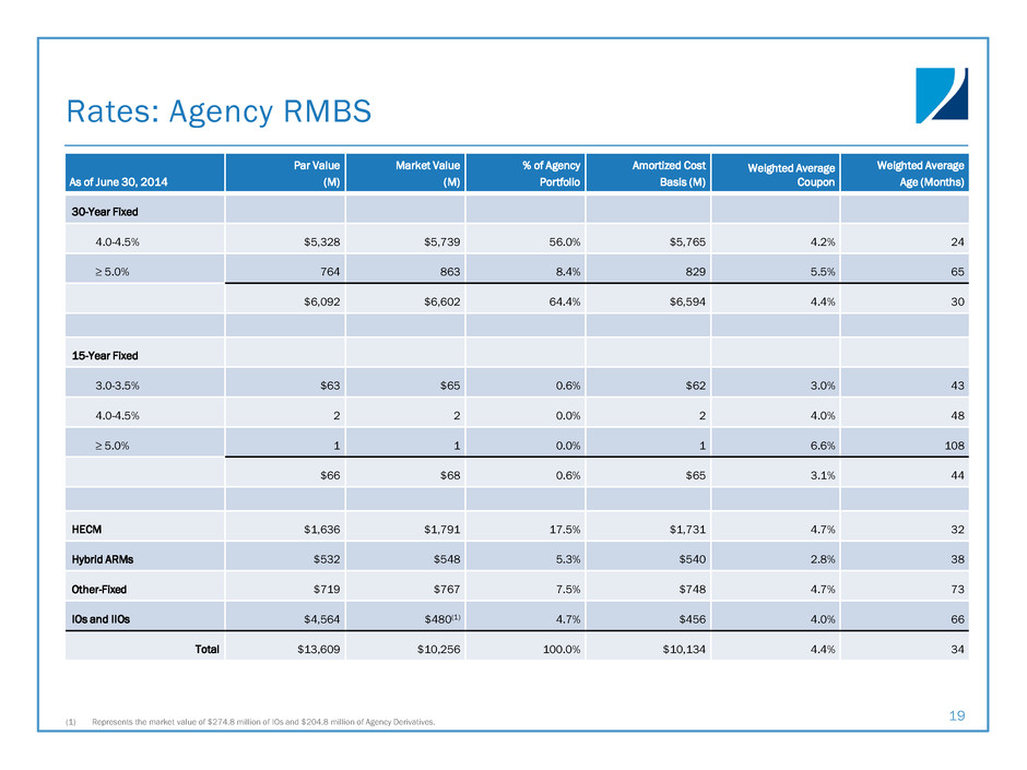 Rates: Agency RMBS Metrics 18 AGENCY RMBS CPR(5) AGENCY PORTFOLIO YIELDS AND METRICS (1) Agency yield includes impact of Agency Derivatives. Interest income on Agency Derivatives was $7.0 million and $7.9 million for the first and second quarters of 2014, respectively. (2) Cost of financing Agency RMBS includes interest spread expense associated with the portfolio’s interest rate swaps of $12.1 million and $16.0 million for the first and second quarters of 2014, respectively. Interest spread expense increased cost of financing Agency RMBS by 0.5% and 0.7% in the first and second quarters of 2014, respectively. (3) Securities collateralized by loans of less than or equal to $85K. (4) Securities collateralized by loans with greater than or equal to 80% loan-to-value ratio (LTV). High LTV pools are predominately Making Homeownership Affordable (MHA) pools. MHA pools consist of borrowers who have refinanced through HARP. (5) Agency weighted average 3-month Constant Prepayment Rate (CPR) includes IIOs (or Agency Derivatives). (6) Weighted average cost basis includes RMBS principal and interest securities only. Average purchase price utilized carrying value for weighting purposes. (7) Securities collateralized by loans of less than or equal to $175K, but more than $85K. (8) Securities collateralized by loans held by lower credit borrowers as defined by Fair Isaac Corporation (FICO). Portfolio Yield Realized Q1-2014 At March 31, 2014 Realized Q2-2014 At June 30, 2014 Agency yield(1) 3.3% 3.2% 3.4% 3.2% Cost of financing(2) 0.9% 0.9% 1.1% 1.1% Net interest spread 2.4% 2.3% 2.3% 2.1% Portfolio Metrics Q1-2014 Q2-2014 Weighted average 3-month CPR(5) 6.4% 8.5% Weighted average cost basis(6) $108.3 $108.4 Agency: Vintage & Prepayment Protection Q1-2014 Q2-2014 2006 & subsequent vintages – Premium and IOs 14% 18% HECM 18% 18% $85K Max Pools(3) 17% 17% High LTV (predominately MHA)(4) 16% 15% Other Low Loan Balance Pools(7) 12% 12% Low FICO(8) 7% 6% Seasoned (2005 and prior vintages) 5% 5% Prepayment Protected 5% 5% 2006 & subsequent vintages – Discount 6% 4% AGENCY PORTFOLIO COMPOSITION 8.7% 8.7% 7.9% 6.4% 8.5% 0.0% 5.0% 10.0% 15.0% Q2-2013 Q3-2013 Q4-2013 Q1-2014 Q2-2014 Agency RMBS CPR