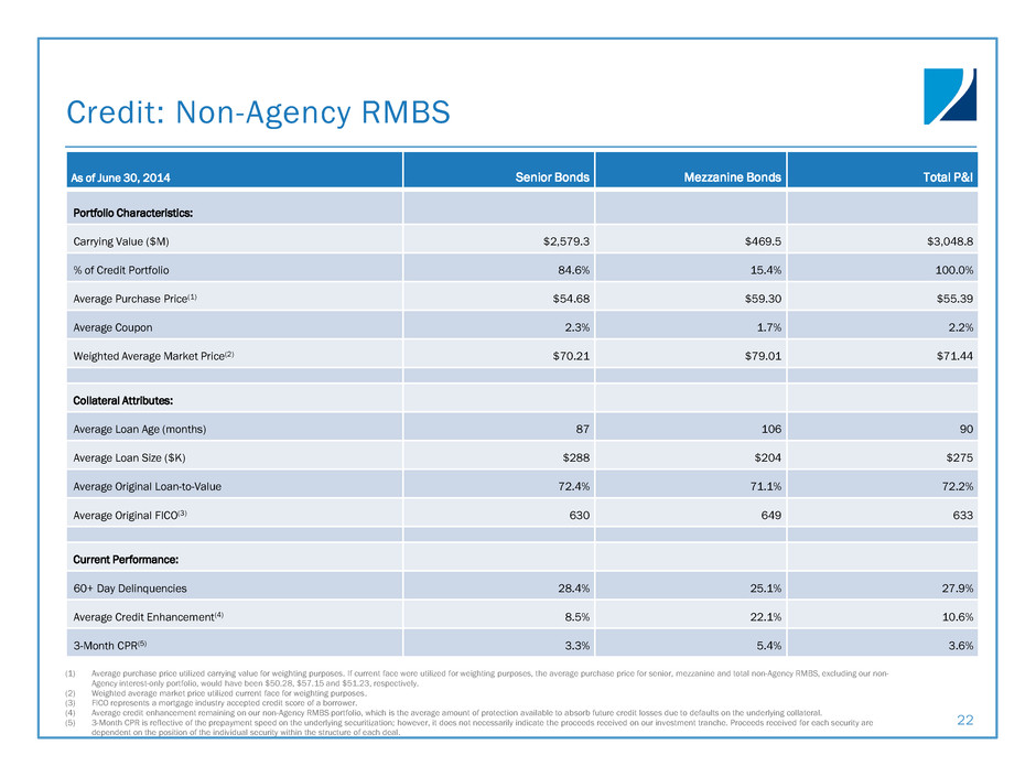 Credit: Non-Agency RMBS Metrics 21 NON-AGENCY PORTFOLIO COMPOSITION NON-AGENCY PORTFOLIO YIELDS AND METRICS (1) Cost of financing non-Agency RMBS includes interest spread expense associated with the portfolio’s interest rate swaps of $2.0 million and $3.1 million for the first and second quarters of 2014, respectively. Interest spread expense increased cost of financing non-Agency RMBS by 0.4% and 0.7% first and second quarters of 2014, respectively. (2) Weighted average cost basis includes RMBS principal and interest securities only. Average purchase price utilized carrying value for weighting purposes. If current face were utilized for weighting purposes, total non-Agency RMBS excluding the company’s non-Agency interest-only portfolio would have been $51.23 at June 30, 2014. Portfolio Yield Realized Q1-2014 At March 31, 2014 Realized Q2-2014 At June 30, 2014 Non-Agency yield 9.1% 9.0% 8.7% 8.6% Cost of financing(1) 2.3% 2.3% 2.6% 2.6% Net interest spread 6.8% 6.7% 6.1% 6.0% NON-AGENCY RMBS CPR Non-Agency: Loan Type Q1-2014 Q2-2014 Sub-Prime 83% 78% Prime 5% 11% Option-ARM 8% 7% Alt-A 4% 4% Portfolio Metrics Q1-2014 Q2-2014 Weighted average 3-month CPR 3.4% 3.6% Weighted average cost basis(2) $53.3 $55.4 4.0% 4.8% 3.8% 3.4% 3.6% 0.0% 2.0% 4.0% 6.0% 8.0% 10.0% Q2-2013 Q3-2013 Q4-2013 Q1-2014 Q2-2014 Non-Agency RMBS CPR
