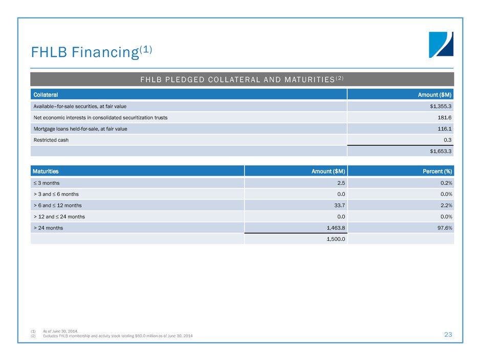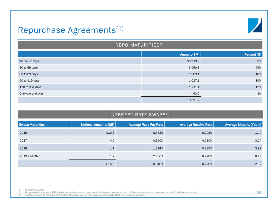 FHLB Financing(1) 23 (1) As of June 30, 2014. (2) Excludes FHLB membership and activity stock totaling $60.0 million as of June 30, 2014 Collateral Amount ($M) Available–for-sale securities, at fair value $1,355.3 Net economic interests in consolidated securitization trusts 181.6 Mortgage loans held-for-sale, at fair value 116.1 Restricted cash 0.3 $1,653.3 Maturities Amount ($M) Percent (%) ≤ 3 months 2.5 0.2% > 3 and ≤ 6 months 0.0 0.0% > 6 and ≤ 12 months 33.7 2.2% > 12 and ≤ 24 months 0.0 0.0% > 24 months 1,463.8 97.6% 1,500.0 F H L B P L E D G E D C O L L AT E RAL A N D M AT U RI T I E S (2 )
