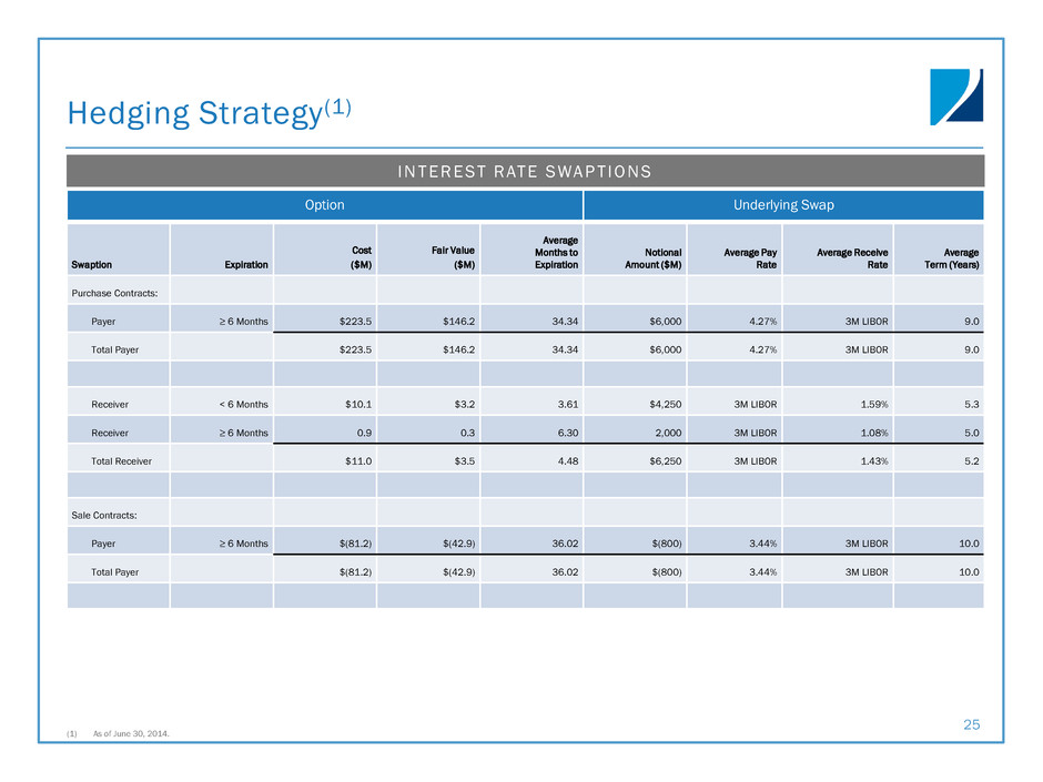 I N T E R E ST R AT E SWA P S (2 ) Repurchase Agreements(1) 24 (1) As of June 30, 2014. (2) Pledged collateral includes RMBS, Agency Derivatives and mortgage loans held-for-sale; does not include U.S. Treasuries with repurchase agreements of $1.0 billion outstanding. (3) Notional amounts do not include $7.0 billion of notional interest rate swaps economically hedging our investment portfolio. Swaps Maturities Notional Amounts ($B) Average Fixed Pay Rate Average Receive Rate Average Maturity (Years) 2016 $10.3 0.563% 0.228% 1.92 2017 4.0 0.950% 0.230% 3.04 2018 1.1 1.314% 0.230% 3.99 2019 and after 1.2 2.536% 0.228% 8.79 $16.6 0.848% 0.228% 2.82 Amount ($M) Percent (%) Within 30 days $3,919.9 38% 30 to 59 days 3,050.8 29% 60 to 89 days 1,089.1 10% 90 to 119 days 1,027.1 10% 120 to 364 days 1,211.1 12% One year and over 93.2 1% 10,391.2 R E P O M AT U R IT IE S (2 )