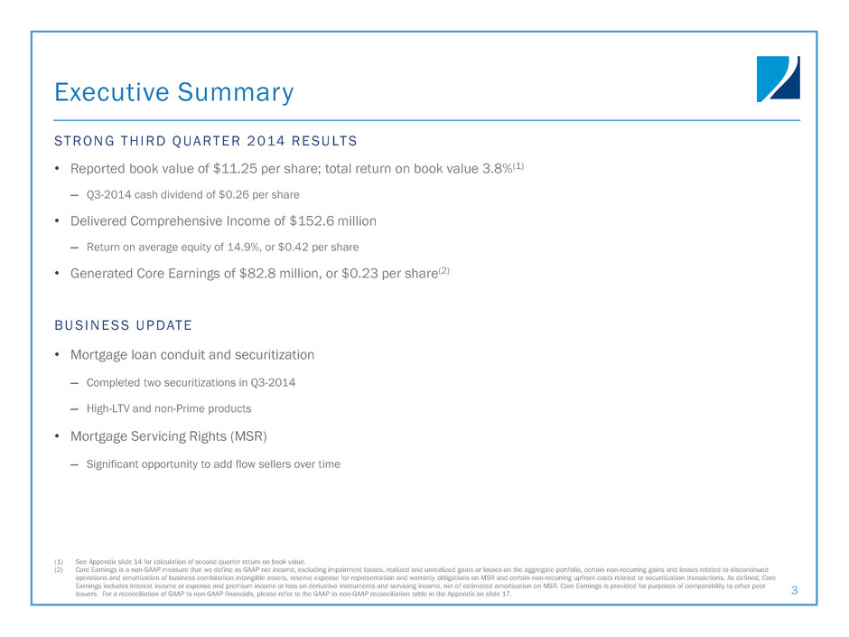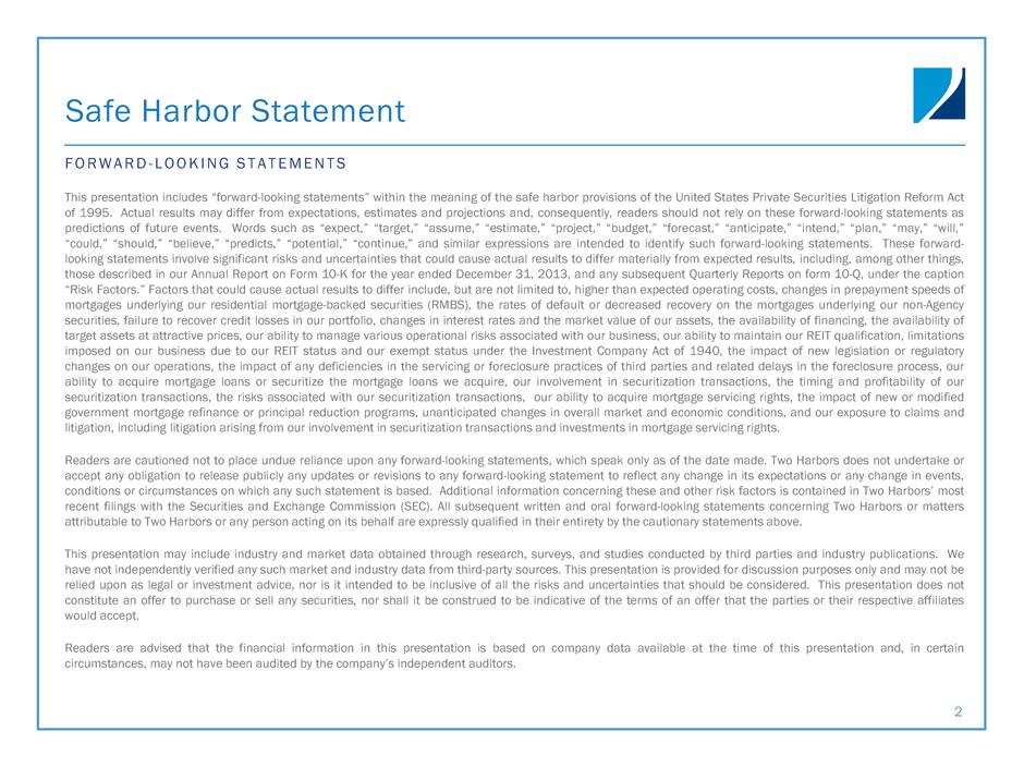 Safe Harbor Statement F O R W A R D - L O O K I N G S T A T E M EN T S This presentation includes “forward-looking statements” within the meaning of the safe harbor provisions of the United States Private Securities Litigation Reform Act of 1995. Actual results may differ from expectations, estimates and projections and, consequently, readers should not rely on these forward-looking statements as predictions of future events. Words such as “expect,” “target,” “assume,” “estimate,” “project,” “budget,” “forecast,” “anticipate,” “intend,” “plan,” “may,” “will,” “could,” “should,” “believe,” “predicts,” “potential,” “continue,” and similar expressions are intended to identify such forward-looking statements. These forward- looking statements involve significant risks and uncertainties that could cause actual results to differ materially from expected results, including, among other things, those described in our Annual Report on Form 10-K for the year ended December 31, 2013, and any subsequent Quarterly Reports on form 10-Q, under the caption “Risk Factors.” Factors that could cause actual results to differ include, but are not limited to, higher than expected operating costs, changes in prepayment speeds of mortgages underlying our residential mortgage-backed securities (RMBS), the rates of default or decreased recovery on the mortgages underlying our non-Agency securities, failure to recover credit losses in our portfolio, changes in interest rates and the market value of our assets, the availability of financing, the availability of target assets at attractive prices, our ability to manage various operational risks associated with our business, our ability to maintain our REIT qualification, limitations imposed on our business due to our REIT status and our exempt status under the Investment Company Act of 1940, the impact of new legislation or regulatory changes on our operations, the impact of any deficiencies in the servicing or foreclosure practices of third parties and related delays in the foreclosure process, our ability to acquire mortgage loans or securitize the mortgage loans we acquire, our involvement in securitization transactions, the timing and profitability of our securitization transactions, the risks associated with our securitization transactions, our ability to acquire mortgage servicing rights, the impact of new or modified government mortgage refinance or principal reduction programs, unanticipated changes in overall market and economic conditions, and our exposure to claims and litigation, including litigation arising from our involvement in securitization transactions and investments in mortgage servicing rights. Readers are cautioned not to place undue reliance upon any forward-looking statements, which speak only as of the date made. Two Harbors does not undertake or accept any obligation to release publicly any updates or revisions to any forward-looking statement to reflect any change in its expectations or any change in events, conditions or circumstances on which any such statement is based. Additional information concerning these and other risk factors is contained in Two Harbors’ most recent filings with the Securities and Exchange Commission (SEC). All subsequent written and oral forward-looking statements concerning Two Harbors or matters attributable to Two Harbors or any person acting on its behalf are expressly qualified in their entirety by the cautionary statements above. This presentation may include industry and market data obtained through research, surveys, and studies conducted by third parties and industry publications. We have not independently verified any such market and industry data from third-party sources. This presentation is provided for discussion purposes only and may not be relied upon as legal or investment advice, nor is it intended to be inclusive of all the risks and uncertainties that should be considered. This presentation does not constitute an offer to purchase or sell any securities, nor shall it be construed to be indicative of the terms of an offer that the parties or their respective affiliates would accept. Readers are advised that the financial information in this presentation is based on company data available at the time of this presentation and, in certain circumstances, may not have been audited by the company’s independent auditors. 2