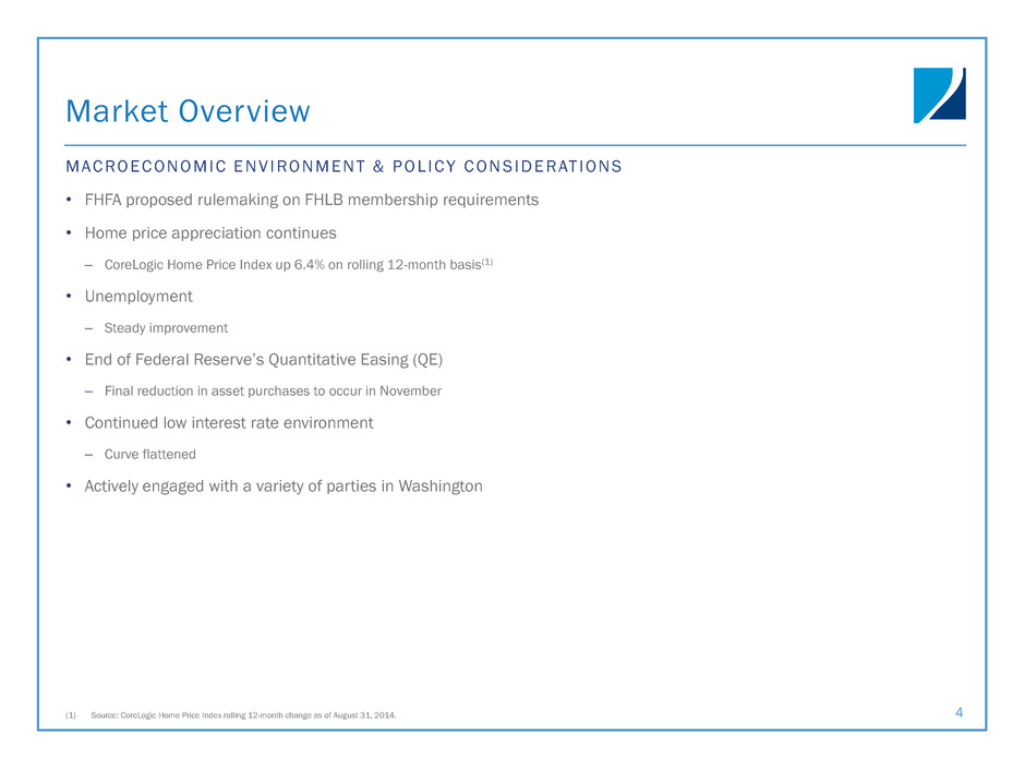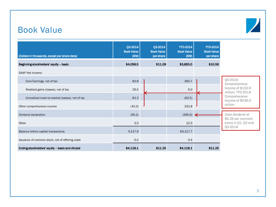 Executive Summary ST RO N G T H I R D Q UA RT E R 2 014 R E S U LT S • Reported book value of $11.25 per share; total return on book value 3.8%(1) — Q3-2014 cash dividend of $0.26 per share • Delivered Comprehensive Income of $152.6 million — Return on average equity of 14.9%, or $0.42 per share • Generated Core Earnings of $82.8 million, or $0.23 per share(2) BU S I N E S S U P DATE • Mortgage loan conduit and securitization — Completed two securitizations in Q3-2014 — High-LTV and non-Prime products • Mortgage Servicing Rights (MSR) — Significant opportunity to add flow sellers over time 3 (1) See Appendix slide 14 for calculation of second quarter return on book value. (2) Core Earnings is a non-GAAP measure that we define as GAAP net income, excluding impairment losses, realized and unrealized gains or losses on the aggregate portfolio, certain non-recurring gains and losses related to discontinued operations and amortization of business combination intangible assets, reserve expense for representation and warranty obligations on MSR and certain non-recurring upfront costs related to securitization transactions. As defined, Core Earnings includes interest income or expense and premium income or loss on derivative instruments and servicing income, net of estimated amortization on MSR. Core Earnings is provided for purposes of comparability to other peer issuers. For a reconciliation of GAAP to non-GAAP financials, please refer to the GAAP to non-GAAP reconciliation table in the Appendix on slide 17.