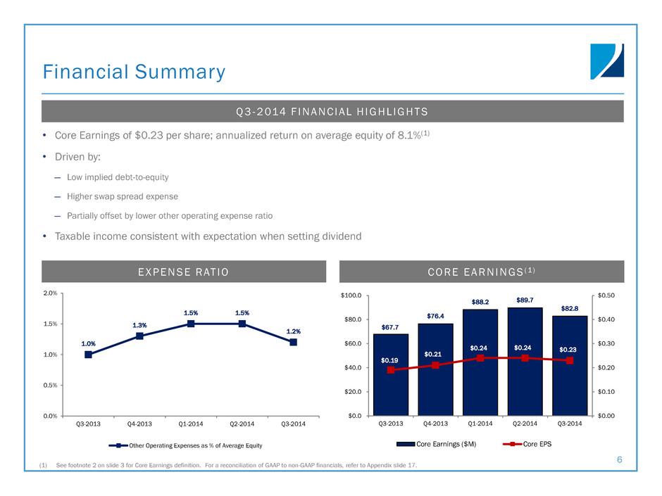 Book Value 5 (Dollars in thousands, except per share data) Q3-2014 Book Value ($M) Q3-2014 Book Value per share YTD-2014 Book Value ($M) YTD-2014 Book Value per share Beginning stockholders’ equity – basic $4,058.5 $11.09 $3,855.0 $10.56 GAAP Net Income: Core Earnings, net of tax 82.8 260.7 Realized gains (losses), net of tax 29.5 6.0 Unrealized mark-to-market (losses), net of tax 81.3 (62.5) Other comprehensive income (41.0) 331.8 Dividend declaration (95.2) (285.6) Other 2.0 12.3 Balance before capital transactions 4,117.9 $4,117.7 Issuance of common stock, net of offering costs 0.2 0.4 Ending stockholders’ equity – basic and diluted $4,118.1 $11.25 $4,118.1 $11.25 Q3-2014 Comprehensive Income of $152.6 million; YTD-2014 Comprehensive Income of $536.0 million Cash dividend of $0.26 per common share in Q1, Q2 and Q3-2014