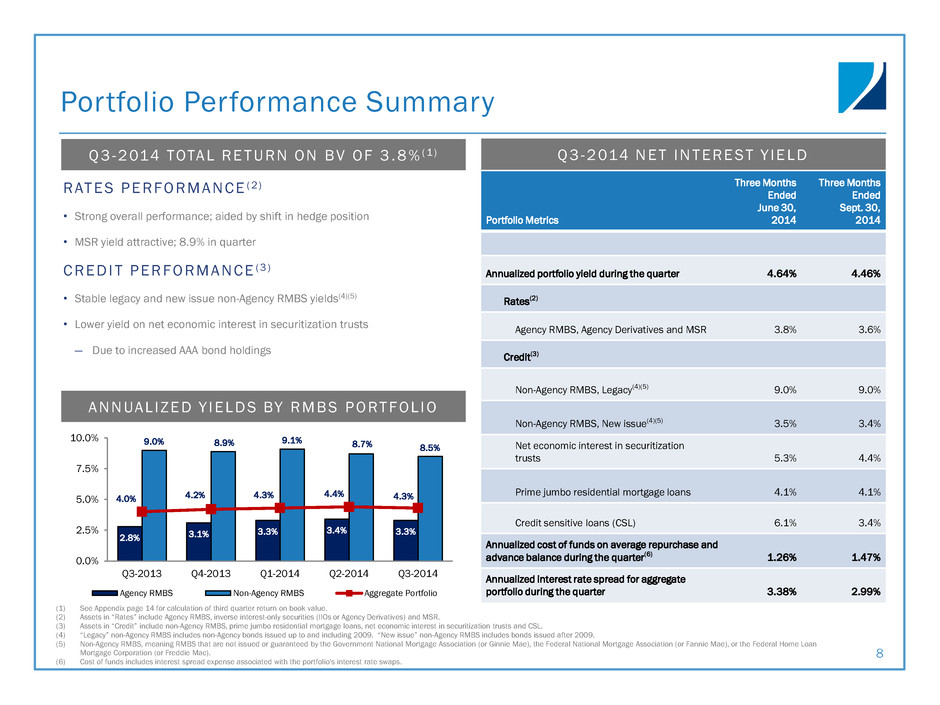 Financing Profile(1) 7 R E P U RC H A SE AG R E E M E NTS • Repo markets functioning in normal manner; no meaningful shifts in financing haircuts or repo rates • Outstanding borrowings of $12.3 billion with 25 active counterparties • Focused on diversification and financial stability across repo counterparties ― Added one new counterparty during the quarter • Continued to ladder repo maturities; average 100 days to maturity(2) F E D E R A L H O M E LOA N BA N K O F D E S M O I N E S • Available borrowings under facility increased to $2.5 billion late in the quarter ― Outstanding secured advances of $1.5 billion ― Average maturity approximately 44 months; borrowing rate 0.4% — Pledged collateral shifting toward certain A-rated or better non-Agency RMBS and prime jumbo residential mortgage loans M AT U R IT Y P RO F I L E O F 2 5 6 DAYS O N AG G R E G ATE R E P O BO R ROW I N G S A N D F H L B A DVANC ES (2 ) (1) Data as of September 30, 2014. (2) Excludes repurchase agreements collateralized by U.S. Treasuries.