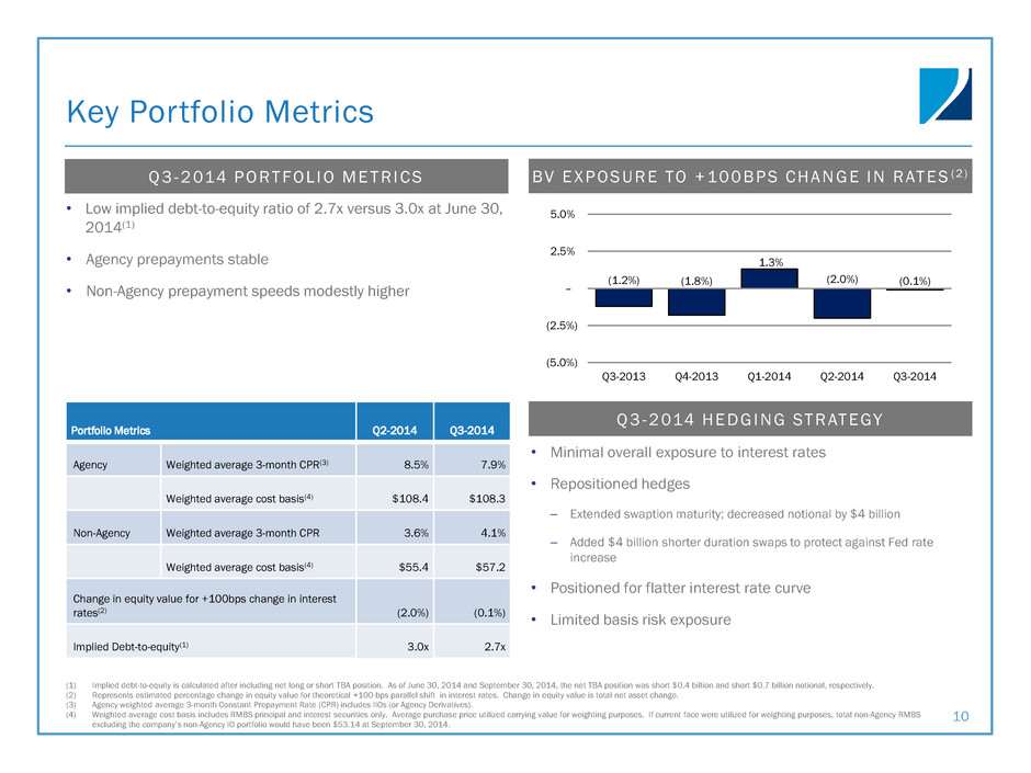TA RG ET E D C A P I TAL A L LO C AT I O N Q 3 - 2 014 H I G H L I G H T S P O RT FO L I O C O M P O S I T I O N Portfolio Composition 9 • 56% capital allocation to Rates — Sold high-LTV and low FICO pools; reinvested in lower loan balance pools — Sold majority of ARM holdings • 44% capital allocation to Credit — Capital allocation to conduit increased quarter-over-quarter Rates(4) $10.4B Credit(5) $3.9B AS OF SEPTEMBER 30, 2014 $14.3B Portfolio $ Millions (1) Assets in “Other” include CSL and non-Agency IOs. (2) Includes IIOs (or Agency Derivatives) of $186.4 million. (3) HECM are loans that allow the homeowner to convert home equity into cash collateralized by the value of their home. (4) Assets in “Rates” include Agency RMBS, Agency Derivatives and MSR. (5) Assets in “Credit” include non-Agency RMBS, prime jumbo residential mortgage loans, net economic interest in securitization trusts and CSL. 30-Year Fixed $6,658 HECM(3) $1,764 Senior $2,474 Mezzanine $518 MSR $498 Hybrid ARMs $132 15-Year Fixed $65 Other-Fixed $793 IOs and IIOs(2) $472 Other(1) $34 57% 53% 52% 54% 54% 57% 58% 57% 56% 36% 37% 38% 46% 46% 43% 42% 43% 44% 7% 10% 10% 0% 10% 20% 30% 40% 50% 60% 70% Rates Credit Residential Real Properties Net Economic Interest in Securitization Trusts $490 Prime Jumbo Loans $419 Dec. 31, 2013 Mar. 31, 2014 Jun. 30, 2014 Sept. 30, 2014 0.0% 1.8% 5.7% 7.6%