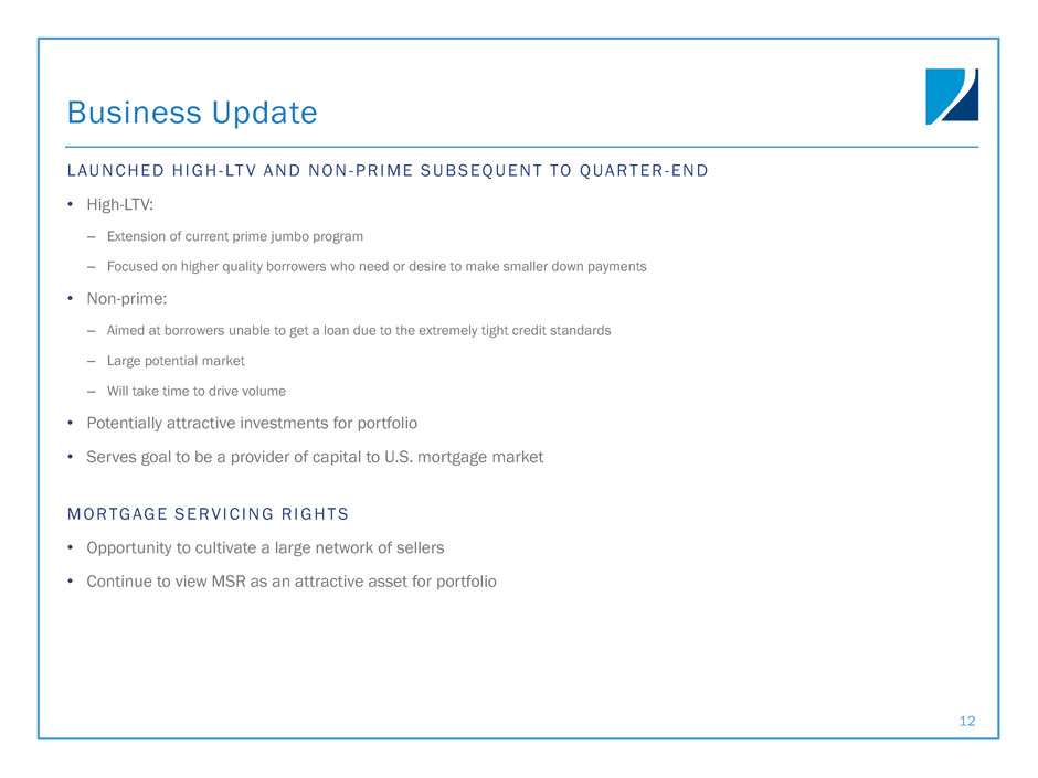 Mortgage Loan Conduit and Securitization C O N D U I T I N I T I A T I VE G A I N I N G M O M E N T U M • Completed two securitizations during the quarter • Pipeline (interest rate locks and prime jumbo holdings) remains strong, approximately $750 million at quarter-end; intend to complete future securitizations as market conditions permit • Retained interest includes AAAs of approximately $390 million and Subs and IOs of approximately $100 million – Expect to shift toward Subs and IOs over time • Focus on building additional originator relationships 11 PRIME JUMBO LOAN SUMMARY – 2014 $4 $8 $22 $54 $138 $243 $471 $461 $296 $395 $268 $642 $642 15 16 18 19 20 21 23 25 28 30 10 20 30 0 200 400 600 800 1,000 1,200 S e ller s C u m u la ti ve U P B ( $ M ill ion s) 2014 Settled Loans - Unsecuritized 2014 Settled Loans - Securitized Sellers (1) “2014 Settled Loans – Securitized” represents loans securitized under Agate Bay Mortgage Trust 2014-1 and Agate Bay Mortgage Trust 2014-2. (1)