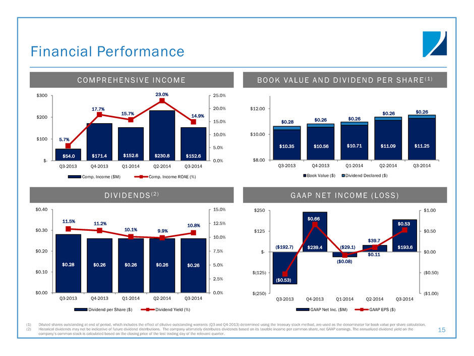 Return on Book Value 14 Return on book value Q3-2014 (Per diluted share amounts, except for percentage) Book value at September 30, 2014 $11.25 Book value at June 30, 2014 11.09 Increase in book value 0.16 Dividend declared in Q3-2014 0.26 Return on book value Q3-2014 $0.42 Return on book value Q3-2014(1) 3.8% Note: Diluted shares outstanding at end of period are used as the denominator for book value per share calculation. (1) Return on book value for quarter ended September 30, 2014 is defined as the increase in book value per diluted share, from June 30, 2014 to September 30, 2014 of $0.16, plus dividend declared of $0.26 per share, divided by June 30, 2014 diluted book value of $11.09 per share.