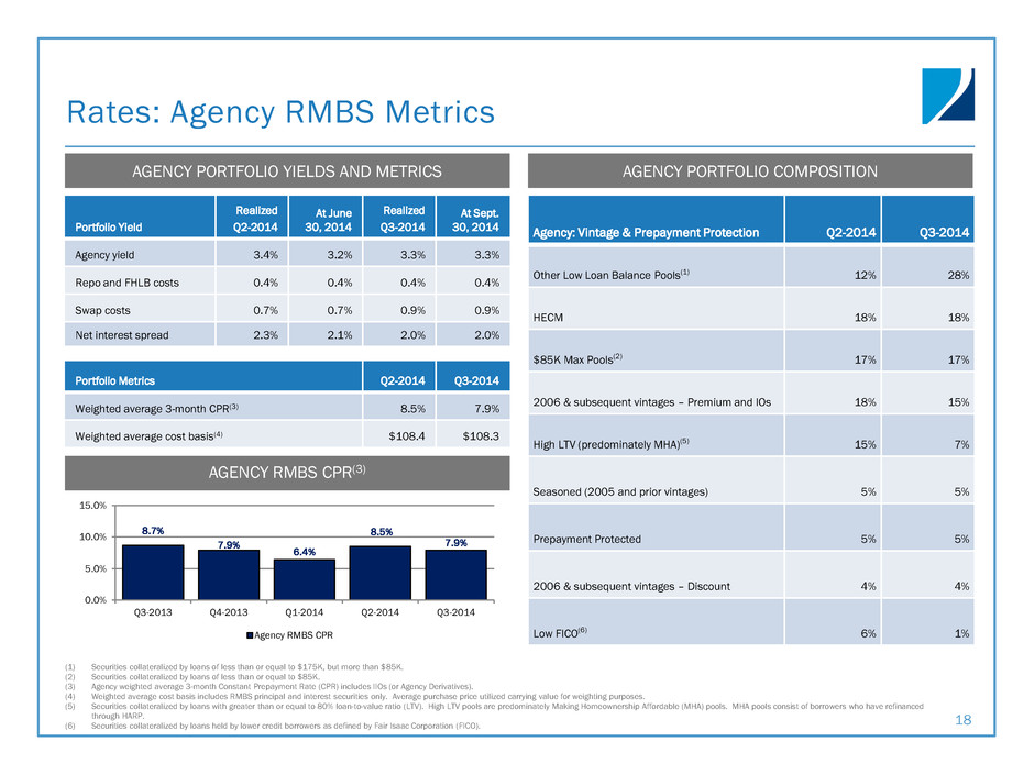 GAAP to Core Earnings Reconciliation 17 (In thousands, except for per share data) Three Months Ended June 30, 2014 Three Months Ended September 30, 2014 Reconciliation of GAAP to non-GAAP Information Core Earnings: Net income $39,657 $193,590 Adjustments for non-core earnings: Gain on sale of securities and mortgage loans, net of tax (34,772) (68,432) Unrealized (gain) loss on trading securities and mortgage loans held-for-sale, net of tax (9,980) 10,479 Realized loss on termination or expiration of swaps and swaptions, net of tax 4,399 28,100 Unrealized loss (gain) on interest rate swaps and swaptions economically hedging investment portfolio, repurchase agreements and FHLB advances, net of tax 78,666 (83,620) Loss on other derivative instruments, net of tax 18,026 713 Realized and unrealized (gain) loss on financing securitizations (20,829) 2,159 Unrealized loss (gain), net of tax, on mortgage servicing rights 14,418 (6,482) Securitization deal costs - 2,181 Amortization of business combination intangible assets, net of tax 86 - Representation and warranty expenses - 4,138 Core Earnings $89,671 $82,826 Weighted average shares outstanding - Diluted 366,078,124 366,118,866 Core Earnings per weighted average share outstanding - Diluted $0.24 $0.23
