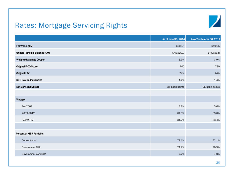 Rates: Mortgage Servicing Rights 20 As of June 30, 2014 As of September 30, 2014 Fair Value ($M) $500.5 $498.5 Unpaid Principal Balance ($M) $45,629.2 $45,526.8 Weighted Average Coupon 3.9% 3.9% Original FICO Score 740 730 Original LTV 74% 74% 60+ Day Delinquencies 1.2% 1.4% Net Servicing Spread 25 basis points 25 basis points Vintage: Pre-2009 3.8% 3.6% 2009-2012 64.5% 63.0% Post 2012 31.7% 33.4% Percent of MSR Portfolio: Conventional 71.1% 72.1% Government FHA 21.7% 20.9% Government VA/USDA 7.2% 7.0%