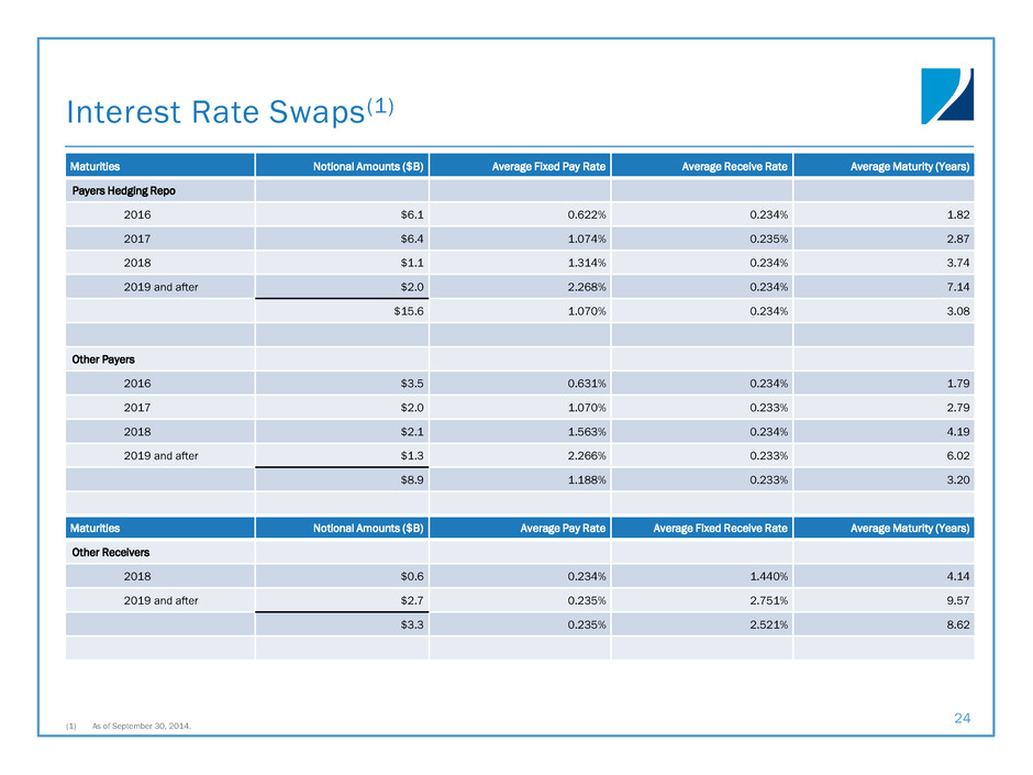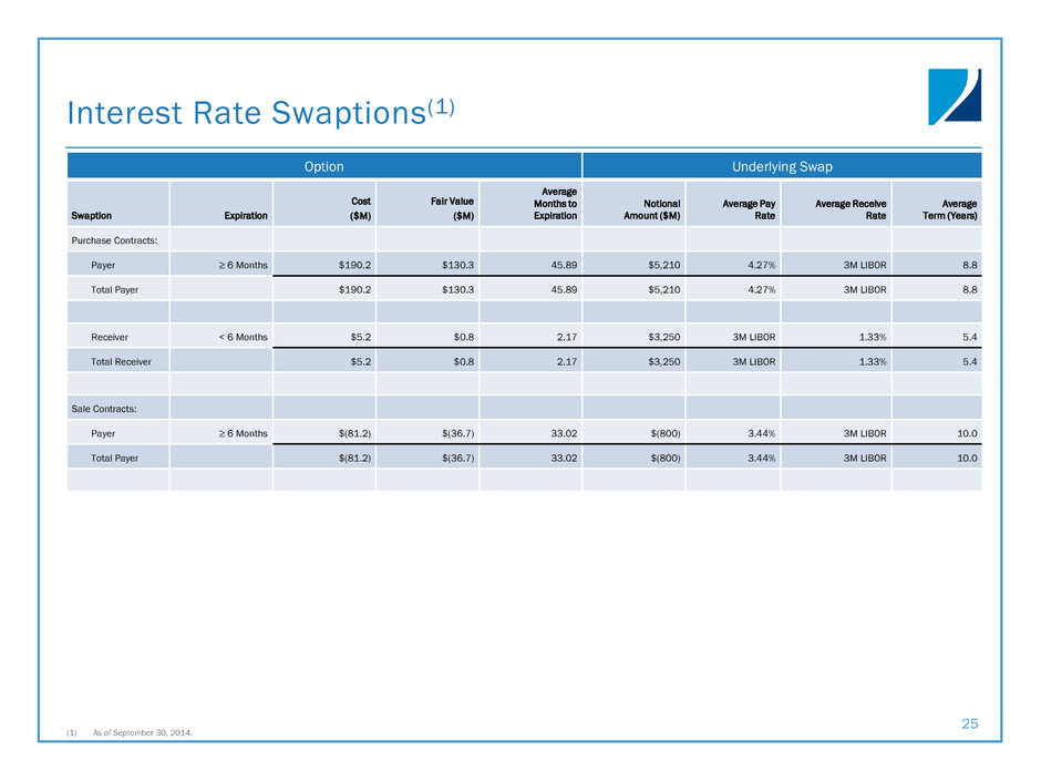 Maturities Notional Amounts ($B) Average Fixed Pay Rate Average Receive Rate Average Maturity (Years) Payers Hedging Repo 2016 $6.1 0.622% 0.234% 1.82 2017 $6.4 1.074% 0.235% 2.87 2018 $1.1 1.314% 0.234% 3.74 2019 and after $2.0 2.268% 0.234% 7.14 $15.6 1.070% 0.234% 3.08 Other Payers 2016 $3.5 0.631% 0.234% 1.79 2017 $2.0 1.070% 0.233% 2.79 2018 $2.1 1.563% 0.234% 4.19 2019 and after $1.3 2.266% 0.233% 6.02 $8.9 1.188% 0.233% 3.20 Maturities Notional Amounts ($B) Average Pay Rate Average Fixed Receive Rate Average Maturity (Years) Other Receivers 2018 $0.6 0.234% 1.440% 4.14 2019 and after $2.7 0.235% 2.751% 9.57 $3.3 0.235% 2.521% 8.62 Interest Rate Swaps(1) 24 (1) As of September 30, 2014.