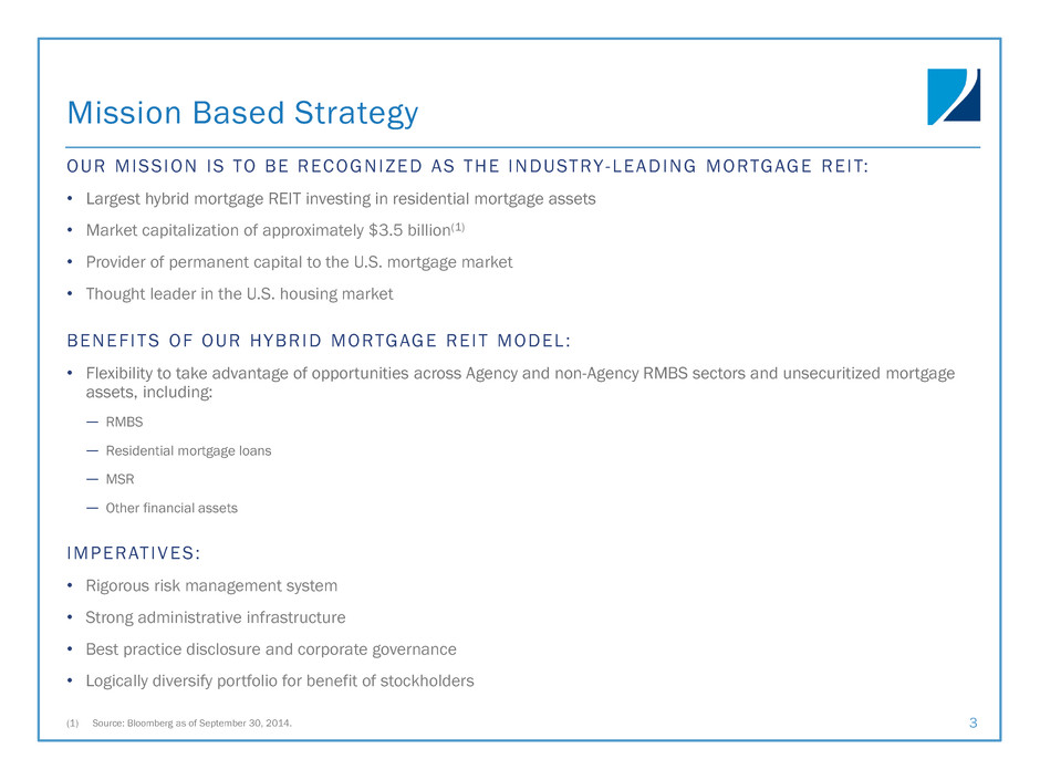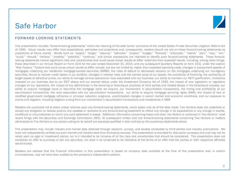 Safe Harbor F O R W A R D - L O O K I N G S T A T E M EN T S This presentation includes “forward-looking statements” within the meaning of the safe harbor provisions of the United States Private Securities Litigation Reform Act of 1995. Actual results may differ from expectations, estimates and projections and, consequently, readers should not rely on these forward-looking statements as predictions of future events. Words such as “expect,” “target,” “assume,” “estimate,” “project,” “budget,” “forecast,” “anticipate,” “intend,” “plan,” “may,” “will,” “could,” “should,” “believe,” “predicts,” “potential,” “continue,” and similar expressions are intended to identify such forward-looking statements. These forward- looking statements involve significant risks and uncertainties that could cause actual results to differ materially from expected results, including, among other things, those described in our Annual Report on Form 10-K for the year ended December 31, 2013, and any subsequent Quarterly Reports on form 10-Q, under the caption “Risk Factors.” Factors that could cause actual results to differ include, but are not limited to, higher than expected operating costs, changes in prepayment speeds of mortgages underlying our residential mortgage-backed securities (RMBS), the rates of default or decreased recovery on the mortgages underlying our non-Agency securities, failure to recover credit losses in our portfolio, changes in interest rates and the market value of our assets, the availability of financing, the availability of target assets at attractive prices, our ability to manage various operational risks associated with our business, our ability to maintain our REIT qualification, limitations imposed on our business due to our REIT status and our exempt status under the Investment Company Act of 1940, the impact of new legislation or regulatory changes on our operations, the impact of any deficiencies in the servicing or foreclosure practices of third parties and related delays in the foreclosure process, our ability to acquire mortgage loans or securitize the mortgage loans we acquire, our involvement in securitization transactions, the timing and profitability of our securitization transactions, the risks associated with our securitization transactions, our ability to acquire mortgage servicing rights (MSR), the impact of new or modified government mortgage refinance or principal reduction programs, unanticipated changes in overall market and economic conditions, and our exposure to claims and litigation, including litigation arising from our involvement in securitization transactions and investments in MSR. Readers are cautioned not to place undue reliance upon any forward-looking statements, which speak only as of the date made. Two Harbors does not undertake or accept any obligation to release publicly any updates or revisions to any forward-looking statement to reflect any change in its expectations or any change in events, conditions or circumstances on which any such statement is based. Additional information concerning these and other risk factors is contained in Two Harbors’ most recent filings with the Securities and Exchange Commission (SEC). All subsequent written and oral forward-looking statements concerning Two Harbors or matters attributable to Two Harbors or any person acting on its behalf are expressly qualified in their entirety by the cautionary statements above. This presentation may include industry and market data obtained through research, surveys, and studies conducted by third parties and industry publications. We have not independently verified any such market and industry data from third-party sources. This presentation is provided for discussion purposes only and may not be relied upon as legal or investment advice, nor is it intended to be inclusive of all the risks and uncertainties that should be considered. This presentation does not constitute an offer to purchase or sell any securities, nor shall it be construed to be indicative of the terms of an offer that the parties or their respective affiliates would accept. Readers are advised that the financial information in this presentation is based on company data available at the time of this presentation and, in certain circumstances, may not have been audited by the company’s independent auditors. 2