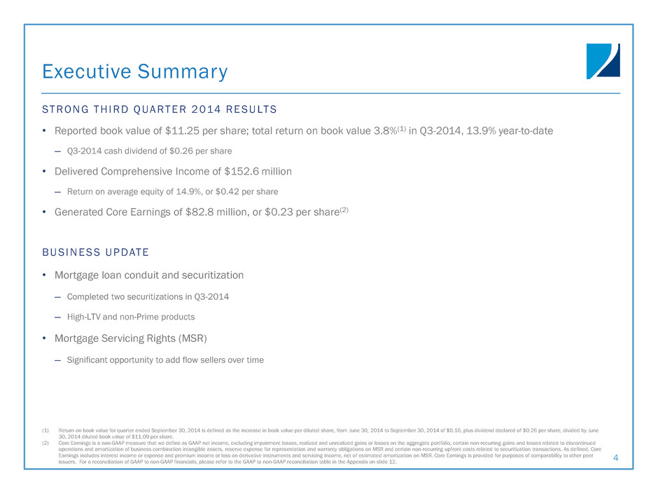 Mission Based Strategy OUR MISSION IS TO BE RECOGNIZED AS THE INDUSTRY -LEADING MORTGAGE REIT: • Largest hybrid mortgage REIT investing in residential mortgage assets • Market capitalization of approximately $3.5 billion(1) • Provider of permanent capital to the U.S. mortgage market • Thought leader in the U.S. housing market BENEFITS OF OUR HYBRID MORTGAGE REIT MODEL: • Flexibility to take advantage of opportunities across Agency and non-Agency RMBS sectors and unsecuritized mortgage assets, including: ― RMBS ― Residential mortgage loans ― MSR ― Other financial assets IMPERATIVES: • Rigorous risk management system • Strong administrative infrastructure • Best practice disclosure and corporate governance • Logically diversify portfolio for benefit of stockholders 3 (1) Source: Bloomberg as of September 30, 2014.
