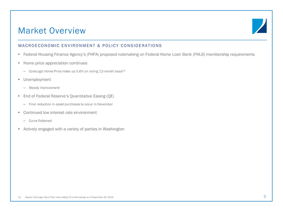 Executive Summary ST RO N G T H I R D Q UA RT E R 2 014 R E S U LT S • Reported book value of $11.25 per share; total return on book value 3.8%(1) in Q3-2014, 13.9% year-to-date — Q3-2014 cash dividend of $0.26 per share • Delivered Comprehensive Income of $152.6 million — Return on average equity of 14.9%, or $0.42 per share • Generated Core Earnings of $82.8 million, or $0.23 per share(2) BU S I N E S S U P DATE • Mortgage loan conduit and securitization — Completed two securitizations in Q3-2014 — High-LTV and non-Prime products • Mortgage Servicing Rights (MSR) — Significant opportunity to add flow sellers over time 4 (1) Return on book value for quarter ended September 30, 2014 is defined as the increase in book value per diluted share, from June 30, 2014 to September 30, 2014 of $0.16, plus dividend declared of $0.26 per share, divided by June 30, 2014 diluted book value of $11.09 per share. (2) Core Earnings is a non-GAAP measure that we define as GAAP net income, excluding impairment losses, realized and unrealized gains or losses on the aggregate portfolio, certain non-recurring gains and losses related to discontinued operations and amortization of business combination intangible assets, reserve expense for representation and warranty obligations on MSR and certain non-recurring upfront costs related to securitization transactions. As defined, Core Earnings includes interest income or expense and premium income or loss on derivative instruments and servicing income, net of estimated amortization on MSR. Core Earnings is provided for purposes of comparability to other peer issuers. For a reconciliation of GAAP to non-GAAP financials, please refer to the GAAP to non-GAAP reconciliation table in the Appendix on slide 12.