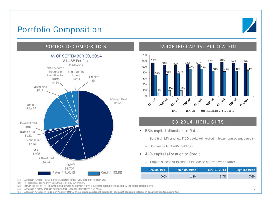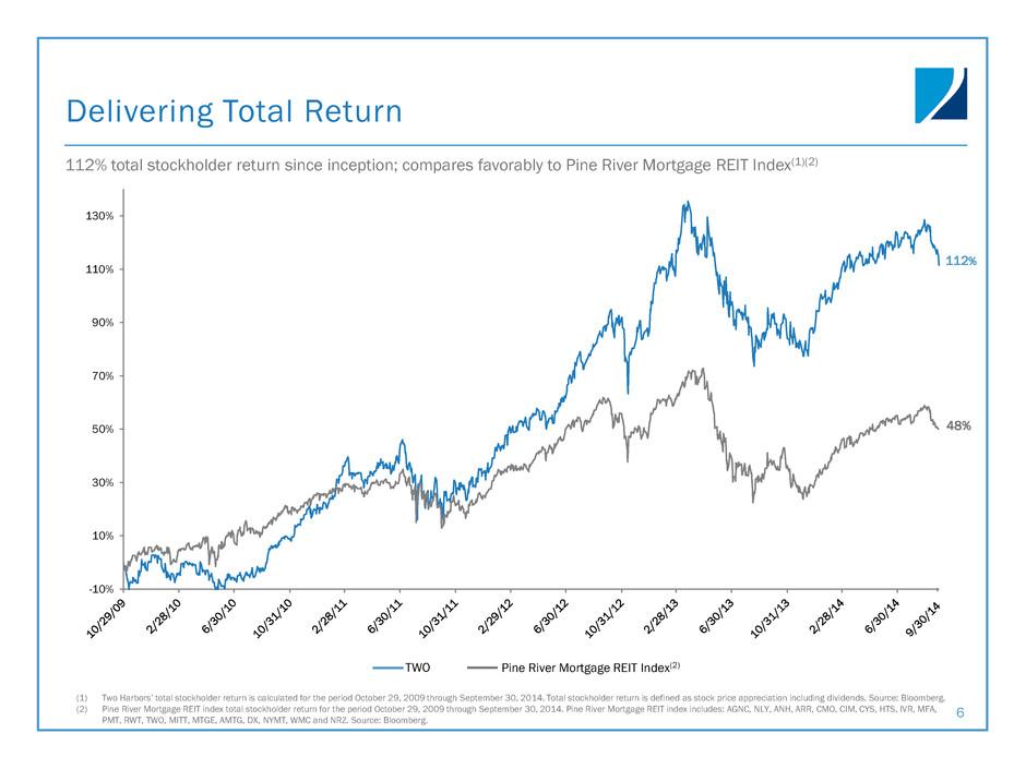 Delivering Total Return 112% total stockholder return since inception; compares favorably to Pine River Mortgage REIT Index(1)(2) (1) Two Harbors’ total stockholder return is calculated for the period October 29, 2009 through September 30, 2014. Total stockholder return is defined as stock price appreciation including dividends. Source: Bloomberg. (2) Pine River Mortgage REIT index total stockholder return for the period October 29, 2009 through September 30, 2014. Pine River Mortgage REIT index includes: AGNC, NLY, ANH, ARR, CMO, CIM, CYS, HTS, IVR, MFA, PMT, RWT, TWO, MITT, MTGE, AMTG, DX, NYMT, WMC and NRZ. Source: Bloomberg. 6 TWO Pine River Mortgage REIT Index(2) 112% 48% -10% 10% 30% 50% 70% 90% 110% 130%