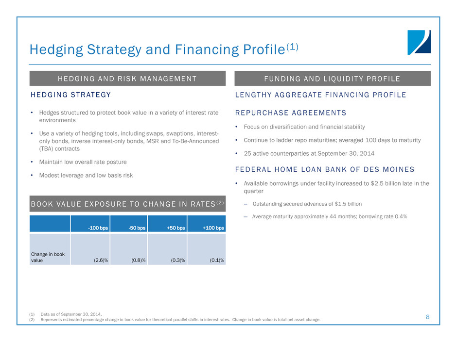 TA RG ET E D C A P I TAL A L LO C AT I O N Q 3 - 2 014 H I G H L I G H T S P O RT FO L I O C O M P O S I T I O N Portfolio Composition 7 • 56% capital allocation to Rates — Sold high-LTV and low FICO pools; reinvested in lower loan balance pools — Sold majority of ARM holdings • 44% capital allocation to Credit — Capital allocation to conduit increased quarter-over-quarter Rates(4) $10.4B Credit(5) $3.9B AS OF SEPTEMBER 30, 2014 $14.3B Portfolio $ Millions (1) Assets in “Other” include credit sensitive loans (CSL) and non-Agency IOs. (2) Includes IIOs (or Agency Derivatives) of $186.4 million. (3) HECM are loans that allow the homeowner to convert home equity into cash collateralized by the value of their home. (4) Assets in “Rates” include Agency RMBS, Agency Derivatives and MSR. (5) Assets in “Credit” include non-Agency RMBS, prime jumbo residential mortgage loans, net economic interest in securitization trusts and CSL. 30-Year Fixed $6,658 HECM(3) $1,764 Senior $2,474 Mezzanine $518 MSR $498 Hybrid ARMs $132 15-Year Fixed $65 Other-Fixed $793 IOs and IIOs(2) $472 Other(1) $34 57% 53% 52% 54% 54% 57% 58% 57% 56% 36% 37% 38% 46% 46% 43% 42% 43% 44% 7% 10% 10% 0% 10% 20% 30% 40% 50% 60% 70% Rates Credit Residential Real Properties Net Economic Interest in Securitization Trusts $490 Prime Jumbo Loans $419 Dec. 31, 2013 Mar. 31, 2014 Jun. 30, 2014 Sept. 30, 2014 0.0% 1.8% 5.7% 7.6%