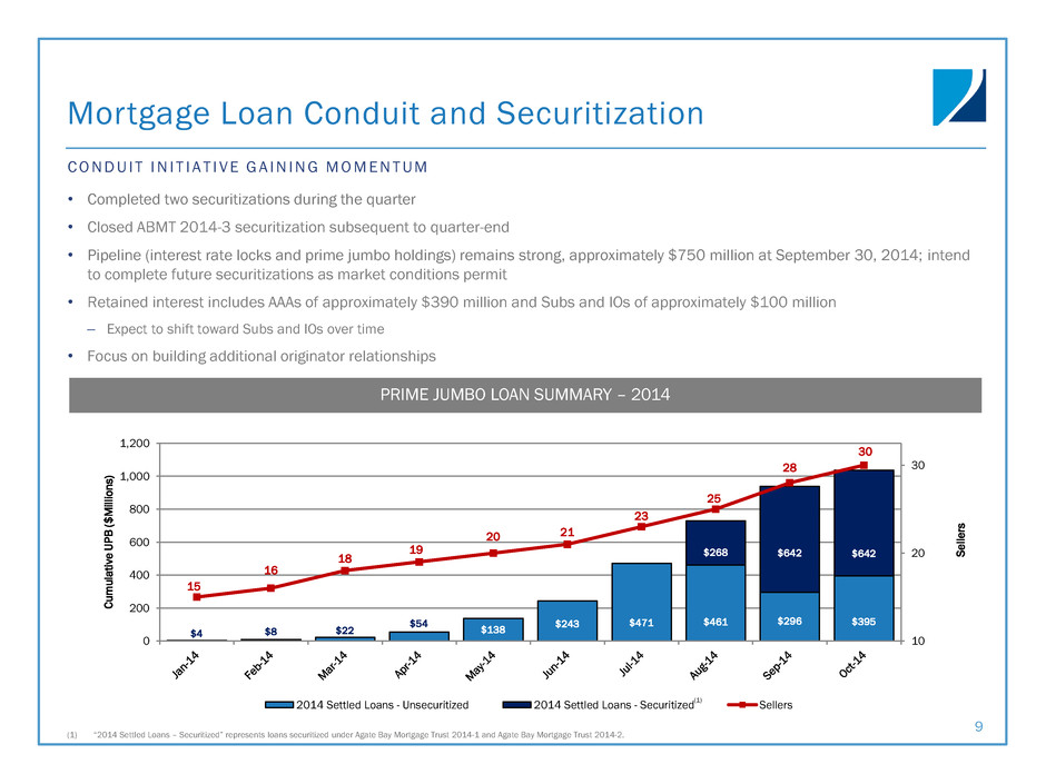 Mortgage Loan Conduit and Securitization C O N D U I T I N I T I A T I VE G A I N I N G M O M E N T U M • Completed two securitizations during the quarter • Closed ABMT 2014-3 securitization subsequent to quarter-end • Pipeline (interest rate locks and prime jumbo holdings) remains strong, approximately $750 million at September 30, 2014; intend to complete future securitizations as market conditions permit • Retained interest includes AAAs of approximately $390 million and Subs and IOs of approximately $100 million – Expect to shift toward Subs and IOs over time • Focus on building additional originator relationships 9 PRIME JUMBO LOAN SUMMARY – 2014 $4 $8 $22 $54 $138 $243 $471 $461 $296 $395 $268 $642 $642 15 16 18 19 20 21 23 25 28 30 10 20 30 0 200 400 600 800 1,000 1,200 S e ller s C u m u la ti ve U P B ( $ M ill ion s) 2014 Settled Loans - Unsecuritized 2014 Settled Loans - Securitized Sellers (1) “2014 Settled Loans – Securitized” represents loans securitized under Agate Bay Mortgage Trust 2014-1 and Agate Bay Mortgage Trust 2014-2. (1)