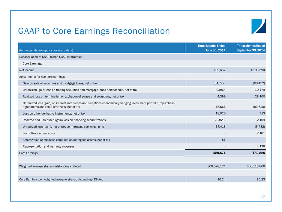 GAAP to Core Earnings Reconciliation 12 (In thousands, except for per share data) Three Months Ended June 30, 2014 Three Months Ended September 30, 2014 Reconciliation of GAAP to non-GAAP Information Core Earnings: Net income $39,657 $193,590 Adjustments for non-core earnings: Gain on sale of securities and mortgage loans, net of tax (34,772) (68,432) Unrealized (gain) loss on trading securities and mortgage loans held-for-sale, net of tax (9,980) 10,479 Realized loss on termination or expiration of swaps and swaptions, net of tax 4,399 28,100 Unrealized loss (gain) on interest rate swaps and swaptions economically hedging investment portfolio, repurchase agreements and FHLB advances, net of tax 78,666 (83,620) Loss on other derivative instruments, net of tax 18,026 713 Realized and unrealized (gain) loss on financing securitizations (20,829) 2,159 Unrealized loss (gain), net of tax, on mortgage servicing rights 14,418 (6,482) Securitization deal costs - 2,181 Amortization of business combination intangible assets, net of tax 86 - Representation and warranty expenses - 4,138 Core Earnings $89,671 $82,826 Weighted average shares outstanding - Diluted 366,078,124 366,118,866 Core Earnings per weighted average share outstanding - Diluted $0.24 $0.23