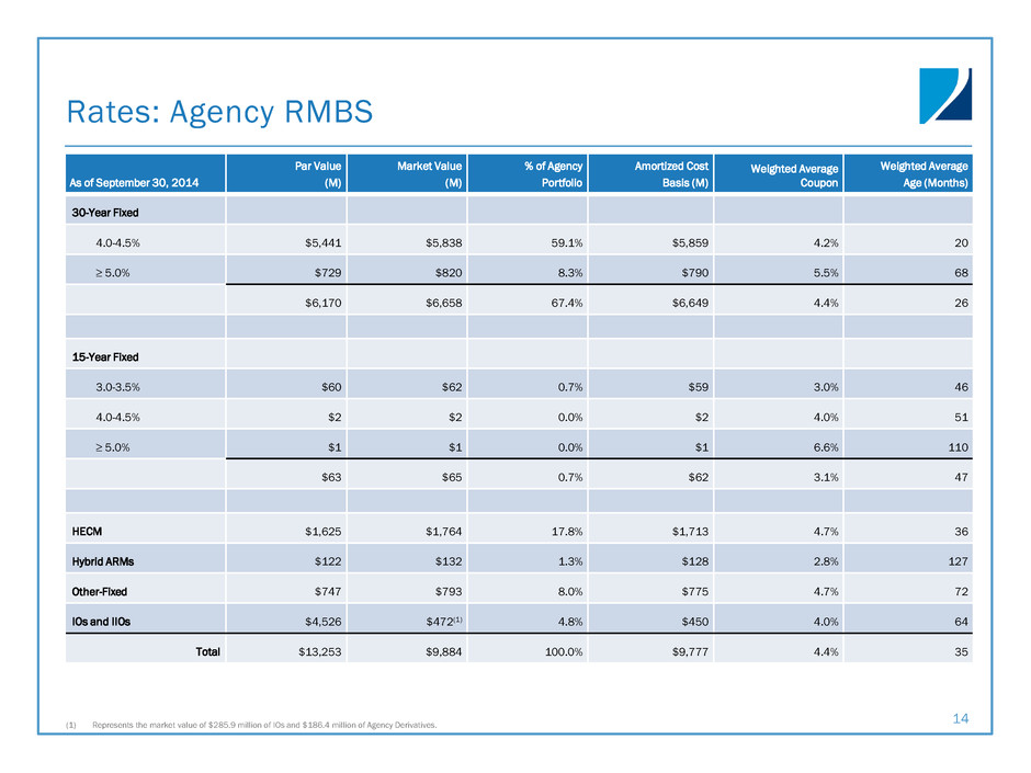 Rates: Agency RMBS Metrics 13 AGENCY RMBS CPR(3) AGENCY PORTFOLIO YIELDS AND METRICS (1) Securities collateralized by loans of less than or equal to $175K, but more than $85K. (2) Securities collateralized by loans of less than or equal to $85K. (3) Agency weighted average 3-month Constant Prepayment Rate (CPR) includes IIOs (or Agency Derivatives). (4) Weighted average cost basis includes RMBS principal and interest securities only. Average purchase price utilized carrying value for weighting purposes. (5) Securities collateralized by loans with greater than or equal to 80% loan-to-value ratio (LTV). High LTV pools are predominately Making Homeownership Affordable (MHA) pools. MHA pools consist of borrowers who have refinanced through HARP. (6) Securities collateralized by loans held by lower credit borrowers as defined by Fair Isaac Corporation (FICO). Portfolio Yield Realized Q2-2014 At June 30, 2014 Realized Q3-2014 At Sept. 30, 2014 Agency yield 3.4% 3.2% 3.3% 3.3% Repo and FHLB costs 0.4% 0.4% 0.4% 0.4% Swap costs 0.7% 0.7% 0.9% 0.9% Net interest spread 2.3% 2.1% 2.0% 2.0% Portfolio Metrics Q2-2014 Q3-2014 Weighted average 3-month CPR(3) 8.5% 7.9% Weighted average cost basis(4) $108.4 $108.3 Agency: Vintage & Prepayment Protection Q2-2014 Q3-2014 Other Low Loan Balance Pools(1) 12% 28% HECM 18% 18% $85K Max Pools(2) 17% 17% 2006 & subsequent vintages – Premium and IOs 18% 15% High LTV (predominately MHA)(5) 15% 7% Seasoned (2005 and prior vintages) 5% 5% Prepayment Protected 5% 5% 2006 & subsequent vintages – Discount 4% 4% Low FICO(6) 6% 1% AGENCY PORTFOLIO COMPOSITION 8.7% 7.9% 6.4% 8.5% 7.9% 0.0% 5.0% 10.0% 15.0% Q3-2013 Q4-2013 Q1-2014 Q2-2014 Q3-2014 Agency RMBS CPR