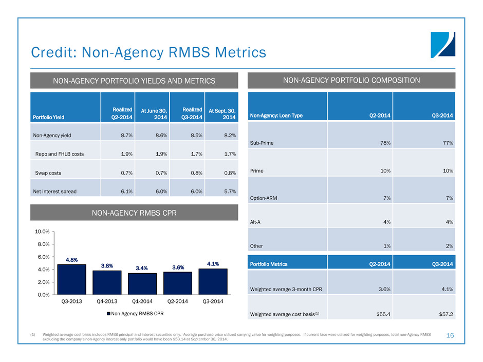 Credit: Non-Agency RMBS Metrics 16 NON-AGENCY PORTFOLIO COMPOSITION NON-AGENCY PORTFOLIO YIELDS AND METRICS (1) Weighted average cost basis includes RMBS principal and interest securities only. Average purchase price utilized carrying value for weighting purposes. If current face were utilized for weighting purposes, total non-Agency RMBS excluding the company’s non-Agency interest-only portfolio would have been $53.14 at September 30, 2014. Portfolio Yield Realized Q2-2014 At June 30, 2014 Realized Q3-2014 At Sept. 30, 2014 Non-Agency yield 8.7% 8.6% 8.5% 8.2% Repo and FHLB costs 1.9% 1.9% 1.7% 1.7% Swap costs 0.7% 0.7% 0.8% 0.8% Net interest spread 6.1% 6.0% 6.0% 5.7% NON-AGENCY RMBS CPR Non-Agency: Loan Type Q2-2014 Q3-2014 Sub-Prime 78% 77% Prime 10% 10% Option-ARM 7% 7% Alt-A 4% 4% Other 1% 2% Portfolio Metrics Q2-2014 Q3-2014 Weighted average 3-month CPR 3.6% 4.1% Weighted average cost basis(1) $55.4 $57.2 4.8% 3.8% 3.4% 3.6% 4.1% 0.0% 2.0% 4.0% 6.0% 8.0% 10.0% Q3-2013 Q4-2013 Q1-2014 Q2-2014 Q3-2014 Non-Agency RMBS CPR