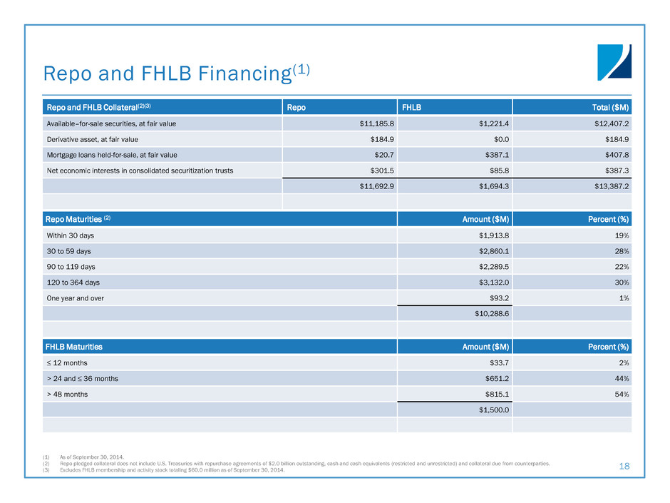 Credit: Non-Agency RMBS 17 As of September 30, 2014 Senior Bonds Mezzanine Bonds Total P&I Portfolio Characteristics: Carrying Value ($M) $2,473.7 $517.7 $2,991.4 % of Credit Portfolio 82.7% 17.3% 100.0% Average Purchase Price(1) $56.08 $62.52 $57.20 Average Coupon 2.2% 1.8% 2.2% Weighted Average Market Price(2) $73.04 $81.88 $74.43 Collateral Attributes: Average Loan Age (months) 88 109 91 Average Loan Size ($K) $372 $275 $357 Average Original Loan-to-Value 70.3% 70.8% 70.4% Average Original FICO(3) 619 648 624 Current Performance: 60+ Day Delinquencies 27.6% 25.4% 27.2% Average Credit Enhancement(4) 8.8% 22.5% 11.0% 3-Month CPR(5) 3.5% 6.8% 4.1% (1) Average purchase price utilized carrying value for weighting purposes. If current face were utilized for weighting purposes, the average purchase price for senior, mezzanine and total non-Agency RMBS, excluding our non- Agency interest-only portfolio, would have been $51.85, $60.17 and $53.14, respectively. (2) Weighted average market price utilized current face for weighting purposes. (3) FICO represents a mortgage industry accepted credit score of a borrower. (4) Average credit enhancement remaining on our non-Agency RMBS portfolio, which is the average amount of protection available to absorb future credit losses due to defaults on the underlying collateral. (5) 3-Month CPR is reflective of the prepayment speed on the underlying securitization; however, it does not necessarily indicate the proceeds received on our investment tranche. Proceeds received for each security are dependent on the position of the individual security within the structure of each deal.