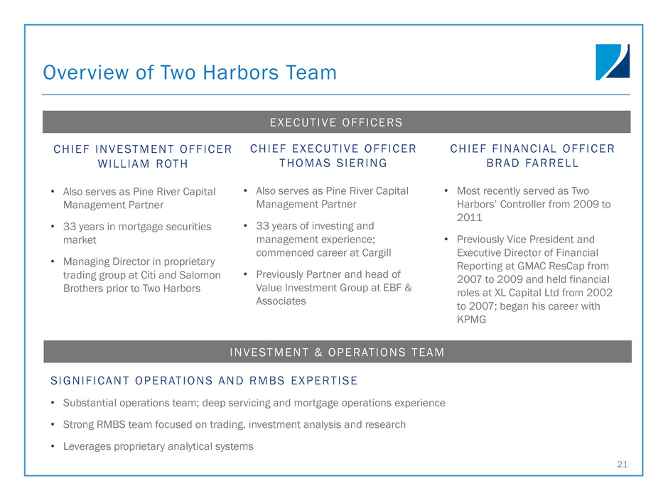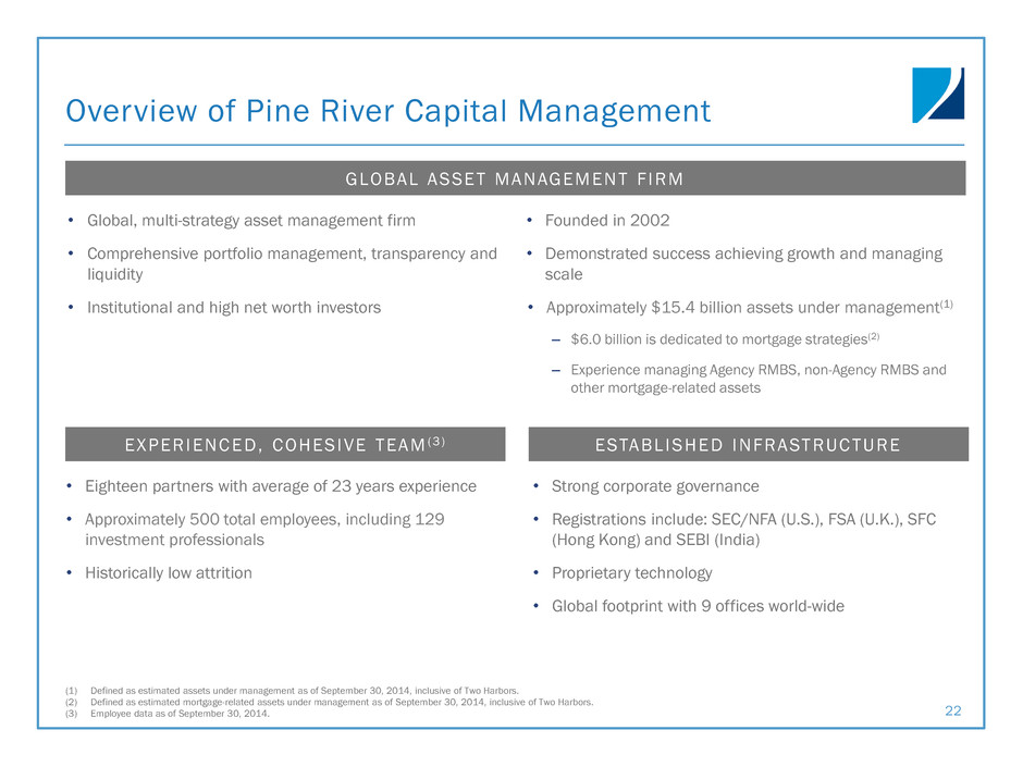 EXECUTIVE OFFICERS Overview of Two Harbors Team 21 CHIEF F INANCIAL OFFICER BRAD FARRELL • Most recently served as Two Harbors’ Controller from 2009 to 2011 • Previously Vice President and Executive Director of Financial Reporting at GMAC ResCap from 2007 to 2009 and held financial roles at XL Capital Ltd from 2002 to 2007; began his career with KPMG SIGNIF ICANT OPERATIONS AND RMBS EXPERTISE • Substantial operations team; deep servicing and mortgage operations experience • Strong RMBS team focused on trading, investment analysis and research • Leverages proprietary analytical systems INVESTMENT & OPERATIONS TEAM CHIEF EXECUTIVE OFFICER THOMAS SIERING • Also serves as Pine River Capital Management Partner • 33 years of investing and management experience; commenced career at Cargill • Previously Partner and head of Value Investment Group at EBF & Associates CHIEF INVESTMENT OFFICER WILL IAM ROTH • Also serves as Pine River Capital Management Partner • 33 years in mortgage securities market • Managing Director in proprietary trading group at Citi and Salomon Brothers prior to Two Harbors