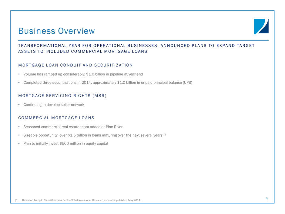 Financial Summary F U L L Y E A R 2 0 1 4 – D E L I VE R ED S T R O N G R E T U R N O N B O O K V A L U E C O N S I D E R I N G C O N S E R V A T I VE P O R T F O L I O P O S I T I O N I N G • Reported book value of $11.10 per share; total return on book value 15.0%(1) — FY-2014 cash dividends of $1.04 per share • Comprehensive Income of $578.2 million — Return on average equity of 14.4%, or $1.58 per share F O U R T H Q U A R T E R 2 0 1 4 • Total return on book value 1.0%(1) — Q4-2014 cash dividend of $0.26 per share • Comprehensive Income of $42.2 million — Return on average equity of 4.1%, or $0.12 per share • Generated Core Earnings of $83.1 million, or $0.23 per share(2) 3 (1) See Appendix slide 17 for calculation of fourth quarter and full year 2014 return on book value. (2) Core Earnings is a non-GAAP measure that we define as GAAP net income, excluding impairment losses, realized and unrealized gains or losses on the aggregate portfolio, gains and losses related to discontinued operations, amortization of business combination intangible assets, reserve expense for representation and warranty obligations on MSR and certain upfront costs related to securitization transactions. As defined, Core Earnings includes interest income or expense and premium income or loss on derivative instruments and servicing income, net of estimated amortization on MSR. Core Earnings is provided for purposes of comparability to other peer issuers. For a reconciliation of GAAP to non-GAAP financials, please refer to the GAAP to non-GAAP reconciliation table in the Appendix on slide 20.