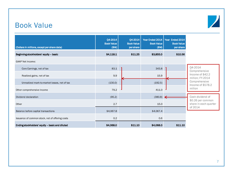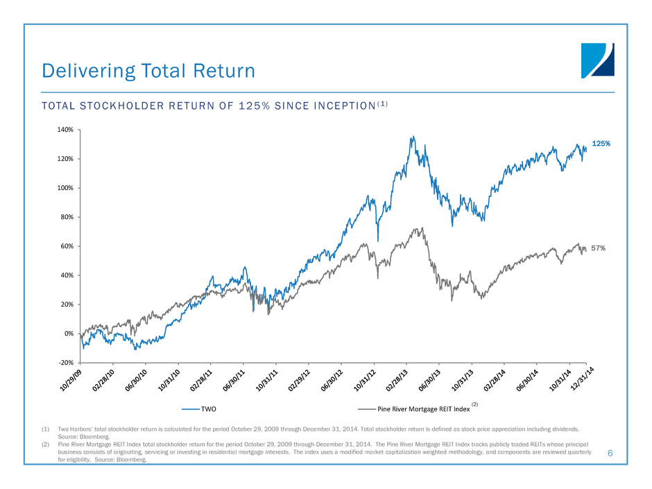-20% 0% 20% 40% 60% 80% 100% 120% 140% TWO Pine River Mortgage REIT Index Delivering Total Return TOTA L STO C K H O L DE R R E T U R N O F 1 2 5 % S I N C E I N C E P T I O N (1 ) 6 125% (1) Two Harbors’ total stockholder return is calculated for the period October 29, 2009 through December 31, 2014. Total stockholder return is defined as stock price appreciation including dividends. Source: Bloomberg. (2) Pine River Mortgage REIT Index total stockholder return for the period October 29, 2009 through December 31, 2014. The Pine River Mortgage REIT Index tracks publicly traded REITs whose principal business consists of originating, servicing or investing in residential mortgage interests. The index uses a modified market capitalization weighted methodology, and components are reviewed quarterly for eligibility. Source: Bloomberg. 57% (2)
