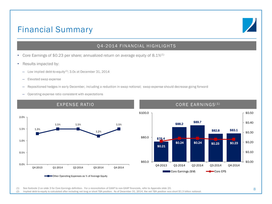 Book Value 7 (Dollars in millions, except per share data) Q4-2014 Book Value ($M) Q4-2014 Book Value per share Year Ended 2014 Book Value ($M) Year Ended 2014 Book Value per share Beginning stockholders’ equity – basic $4,118.1 $11.25 $3,855.0 $10.56 GAAP Net Income: Core Earnings, net of tax 83.1 343.8 Realized gains, net of tax 9.9 15.9 Unrealized mark-to-market losses, net of tax (130.0) (192.5) Other comprehensive income 79.2 411.0 Dividend declaration (95.2) (380.8) Other 2.7 15.0 Balance before capital transactions $4,067.8 $4,067.4 Issuance of common stock, net of offering costs 0.2 0.6 Ending stockholders’ equity – basic and diluted $4,068.0 $11.10 $4,068.0 $11.10 Q4-2014 Comprehensive Income of $42.2 million; FY-2014 Comprehensive Income of $578.2 million Cash dividend of $0.26 per common share in each quarter of 2014