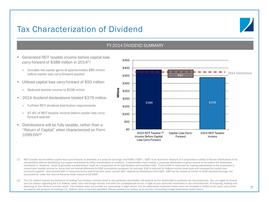 $388 338.0 - - $50 - $338 $0 $50 $100 $150 $200 $250 $300 $350 $400 $450 2014 REIT Taxable Income Before Capital Loss Carry-Forward Capital Loss Carry- Forward 2014 REIT Taxable Income M il lion s Tax Characterization of Dividend • Generated REIT taxable income before capital loss carry-forward of $388 million in 2014(1) – Includes net capital gains of approximately $80 million before capital loss carry-forward applied • Utilized capital loss carry-forward of $50 million – Reduced taxable income to $338 million • 2014 dividend declarations totaled $379 million – Fulfilled REIT dividend distribution requirements – 97.6% of REIT taxable income before capital loss carry- forward applied • Distributions will be fully taxable, rather than a “Return of Capital” when characterized on Form 1099-DIV(2) 9 FY-2014 DIVIDEND SUMMARY 2014 Distributions (1) (1) REIT taxable income before capital loss carry-forward, as depicted, is a proxy for Earnings and Profits (“E&P’). “E&P” is an economic measure of a corporation’s ability to finance distributions to its shareholders without distributing any capital contributed by either shareholders or creditors. A shareholder must include a corporate distribution in gross income to the extent the distribution constitutes a “dividend,” which is generally any distribution made by a corporation to its shareholders out of positive E&P. Current E&P is measured by making adjustments to the corporation’s current year taxable income for items that are treated differently for E&P computation purposes, for example, E&P is reduced for federal income taxes paid and increased for capital loss carryovers applied. Accumulated E&P is measured by the total of all prior years’ current E&P, reduced by distributions from E&P. E&P can be viewed as similar to GAAP retained earnings, but accounted for under the Internal Revenue Code instead of US GAAP. (2) The U.S. federal income tax treatment of holding Two Harbors common stock to any particular stockholder will depend on the stockholder’s particular tax circumstances. You are urged to consult your tax advisor regarding the U.S. federal, state, local and foreign income and other tax consequences to you, in light of your particular investment or tax circumstances, of acquiring, holding and disposing of Two Harbors common stock. Two Harbors does not provide tax, accounting or legal advice. Any tax statements contained herein were not intended or written to be used, and cannot be used for the purpose of avoiding U.S., federal, state or local tax penalties. Please consult your advisor as to any tax, accounting or legal statements made herein.