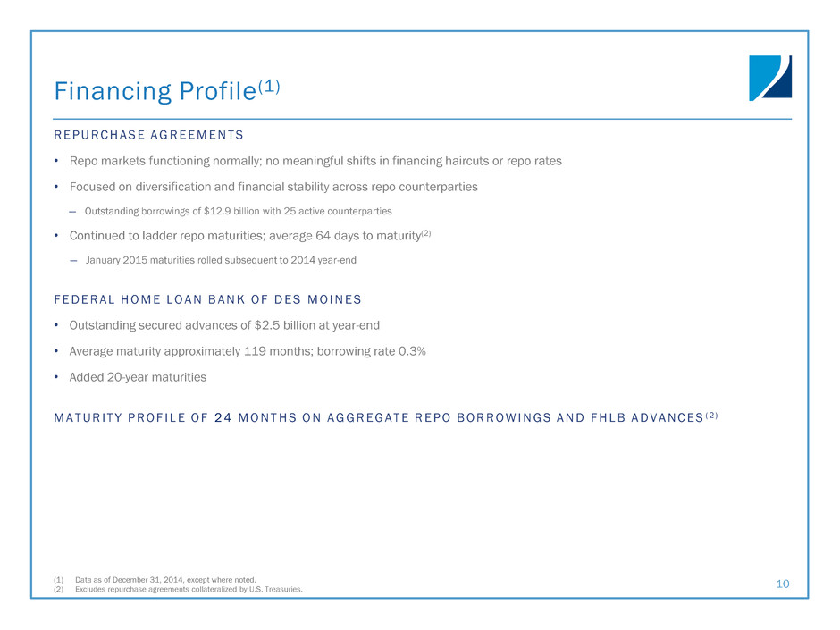 E X P E N S E R AT I O Financial Summary 8 Q 4 - 2 014 F I N A NC IAL H I G H L I G H TS C O R E E A R N I NGS (1 ) (1) See footnote 2 on slide 3 for Core Earnings definition. For a reconciliation of GAAP to non-GAAP financials, refer to Appendix slide 20. (2) Implied debt-to-equity is calculated after including net long or short TBA position. As of December 31, 2014, the net TBA position was short $1.3 billion notional. • Core Earnings of $0.23 per share; annualized return on average equity of 8.1%(1) • Results impacted by: ― Low implied debt-to-equity(2); 3.0x at December 31, 2014 ― Elevated swap expense ― Repositioned hedges in early December, including a reduction in swap notional; swap expense should decrease going forward ― Operating expense ratio consistent with expectations 1.3% 1.5% 1.5% 1.2% 1.5% 0.0% 0.5% 1.0% 1.5% 2.0% Q4-2013 Q1-2014 Q2-2014 Q3-2014 Q4-2014 Other Operating Expenses as % of Average Equity $76.4 $88.2 $89.7 $82.8 $83.1 $0.21 $0.24 $0.24 $0.23 $0.23 $0.00 $0.10 $0.20 $0.30 $0.40 $0.50 $60.0 $80.0 $100.0 Q4-2013 Q1-2014 Q2-2014 Q3-2014 Q4-2014 Core Earnings ($M) Core EPS