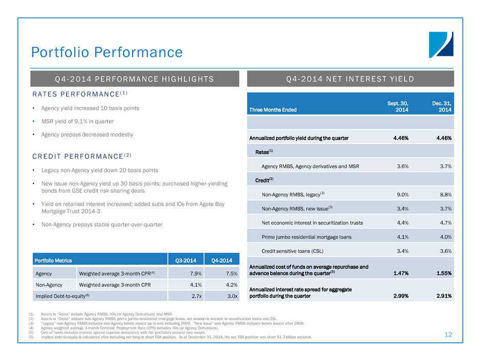 TA RG ET E D C A P I TAL A L LO C AT I O N Q 4 - 2 014 A L LO C AT IO N H I G H L I G H TS P O RT FO L I O C O M P O S I T I O N Portfolio Composition 11 • 56% capital allocation to Rates — Opportunistically added lower loan balance pools • 44% capital allocation to Credit — Continued sales of legacy non-Agency RMBS(3) — Purchased bonds from GSE risk sharing deals — Capital allocation to conduit continued to increase Rates(5) $11.9B Credit(6) $4.1B AS OF DECEMBER 31, 2014 $16.0B Portfolio $ Millions (1) Assets in “Other” include credit sensitive loans (CSL) and non-Agency interest-only securities (IOs). (2) Includes inverse interest-only securities (IIOs or Agency Derivatives) of $186.4 million. (3) Non-Agency RMBS, meaning RMBS that are not issued or guaranteed by the Government National Mortgage Association (or Ginnie Mae), the Federal National Mortgage Association (or Fannie Mae), or the Federal Home Loan Mortgage Corporation (or Freddie Mac). (4) HECM are loans that allow the homeowner to convert home equity into cash collateralized by the value of their home. (5) Assets in “Rates” include Agency RMBS, Agency Derivatives and MSR. (6) Assets in “Credit” include non-Agency RMBS, prime jumbo residential mortgage loans, net economic interest in securitization trusts and CSL. 30-Year Fixed $8,295 HECM(4) $1,741 Senior $2,370 Mezzanine $670 MSR $452 Hybrid ARMs $128 15-Year Fixed $63 Other-Fixed $790 IOs and IIOs(2) $462 Other(1) $43 Net Economic Interest in Securitization Trusts $535 Prime Jumbo Loans $500 Dec. 31, 2013 Mar. 31, 2014 Jun. 30, 2014 Sept. 30, 2014 Dec. 31, 2014 0.0% 1.8% 5.7% 7.6% 9.4% 53% 52% 54% 54% 57% 58% 57% 56% 56% 37% 38% 46% 46% 43% 42% 43% 44% 44% 10% 10% 0% 10% 20% 30% 40% 50% 60% 70% Rates Credit Residential Real Properties