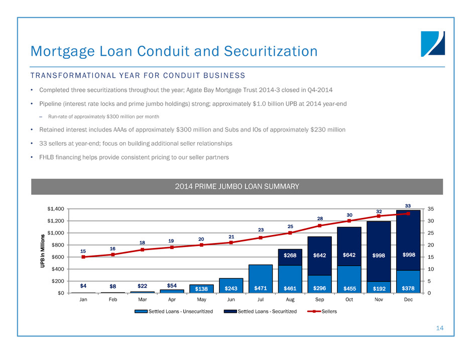 Mortgage Loan Conduit and Securitization T R A N S FO R M AT I O NAL Y E A R FO R C O N D U I T BU S I N E SS • Completed three securitizations throughout the year; Agate Bay Mortgage Trust 2014-3 closed in Q4-2014 • Pipeline (interest rate locks and prime jumbo holdings) strong; approximately $1.0 billion UPB at 2014 year-end – Run-rate of approximately $300 million per month • Retained interest includes AAAs of approximately $300 million and Subs and IOs of approximately $230 million • 33 sellers at year-end; focus on building additional seller relationships • FHLB financing helps provide consistent pricing to our seller partners 14 2014 PRIME JUMBO LOAN SUMMARY $4 $8 $22 $54 $138 $243 $471 $461 $296 $455 $192 $378 $268 $642 $642 $998 $998 15 16 18 19 20 21 23 25 28 30 32 33 0 5 10 15 20 25 30 35 $0 $200 $400 $600 $800 $1,000 $1,200 $1,400 Jan Feb Mar Apr May Jun Jul Aug Sep Oct Nov Dec U P B in M il lion s Settled Loans - Unsecuritized Settled Loans - Securitized Sellers
