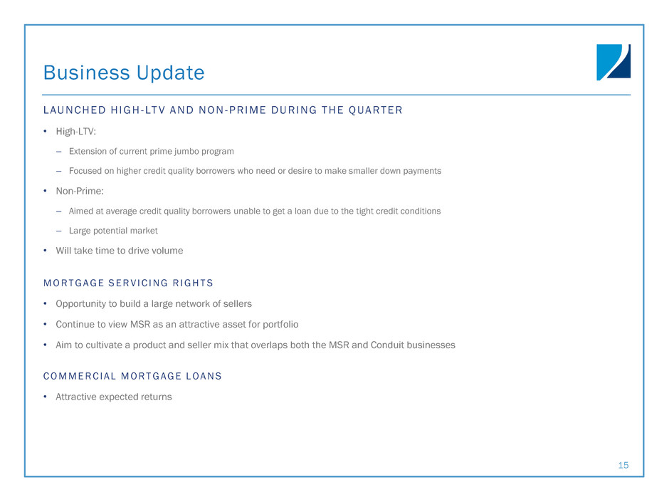 Business Update L AU NC H ED H I G H - LT V A N D N O N - P R I ME D U R I NG T H E Q UA RT E R • High-LTV: – Extension of current prime jumbo program – Focused on higher credit quality borrowers who need or desire to make smaller down payments • Non-Prime: – Aimed at average credit quality borrowers unable to get a loan due to the tight credit conditions – Large potential market • Will take time to drive volume M O R T G A G E S E R V I C I N G R I G H T S • Opportunity to build a large network of sellers • Continue to view MSR as an attractive asset for portfolio • Aim to cultivate a product and seller mix that overlaps both the MSR and Conduit businesses C O M M E R C I A L M O R T G A G E L O A N S • Attractive expected returns 15