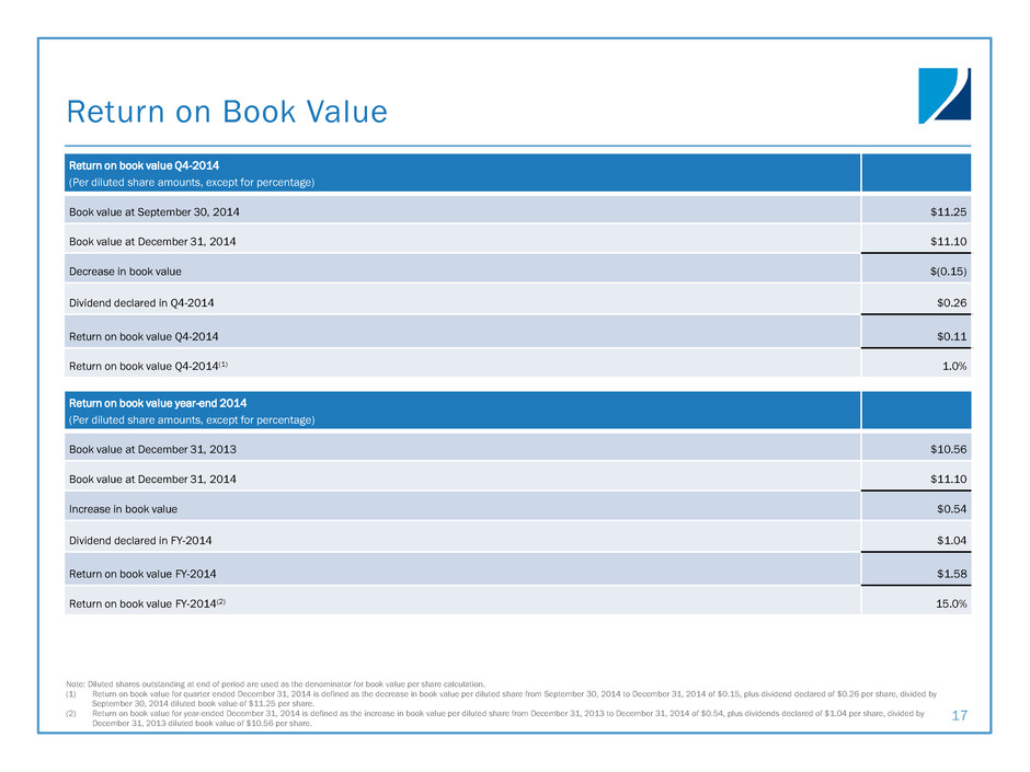 Return on Book Value 17 Return on book value Q4-2014 (Per diluted share amounts, except for percentage) Book value at September 30, 2014 $11.25 Book value at December 31, 2014 $11.10 Decrease in book value $(0.15) Dividend declared in Q4-2014 $0.26 Return on book value Q4-2014 $0.11 Return on book value Q4-2014(1) 1.0% Note: Diluted shares outstanding at end of period are used as the denominator for book value per share calculation. (1) Return on book value for quarter ended December 31, 2014 is defined as the decrease in book value per diluted share from September 30, 2014 to December 31, 2014 of $0.15, plus dividend declared of $0.26 per share, divided by September 30, 2014 diluted book value of $11.25 per share. (2) Return on book value for year-ended December 31, 2014 is defined as the increase in book value per diluted share from December 31, 2013 to December 31, 2014 of $0.54, plus dividends declared of $1.04 per share, divided by December 31, 2013 diluted book value of $10.56 per share. Return on book value year-end 2014 (Per diluted share amounts, except for percentage) Book value at December 31, 2013 $10.56 Book value at December 31, 2014 $11.10 Increase in book value $0.54 Dividend declared in FY-2014 $1.04 Return on book value FY-2014 $1.58 Return on book value FY-2014(2) 15.0%
