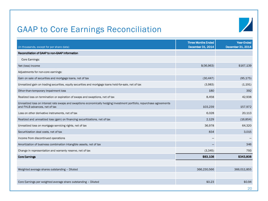 Operating Performance 19 (In millions, except for per share data) Core Earnings Realized Gains Unrealized MTM Q4-2014 Financials Core Earnings Realized Gains Unrealized MTM FY-2014 Financials Interest income $156.2 $ - $ - $156.2 $577.2 $ - $ - $577.2 Interest expense 31.7 - - 31.7 107.5 - - 107.5 Net interest income 124.5 - - 124.5 $469.7 - - $469.7 Net other-than-temporary impairment losses - - (0.2) (0.2) - - (0.4) (0.4) Gain (loss) on investment securities - 24.5 4.2 28.7 - 89.9 (2.7) 87.2 Loss on interest rate swaps and swaptions (32.2) (3.7) (116.7) (152.6) (91.8) (55.3) (198.5) (345.6) Gain (loss) on other derivative instruments 7.0 (14.6) 2.4 (5.2) 26.8 (52.3) 8.0 (17.5) Gain on mortgage loans held-for-sale - 9.1 1.9 11.0 - 13.1 4.2 17.3 Servicing income 31.6 - - 31.6 128.2 - - 128.2 Loss on servicing asset (13.7) - (41.6) (55.3) (54.8) - (73.5) (128.3) Other income (loss) 0.7 (0.7) (1.4) (1.4) 1.7 6.0 10.8 18.5 Total other (loss) income (6.6) 14.6 (151.2) (143.2) 10.1 1.4 (251.7) (240.2) Management fees & other operating expenses 33.7 (3.9) - 29.8 129.2 6.4 - 135.6 Net income (loss) before income taxes 84.2 18.5 (151.4) (48.7) 350.6 (5.0) (252.1) 93.5 Income tax expense (benefit) 1.1 8.6 (21.4) (11.7) 6.8 (20.9) (59.6) (73.7) Net income (loss) $83.1 $9.9 $(130.0) $(37.0) $343.8 $15.9 $(192.5) $167.2 Basic and diluted weighted average EPS $0.23 $0.03 $(0.36) $(0.10) $0.94 $0.04 $(0.52) $0.46