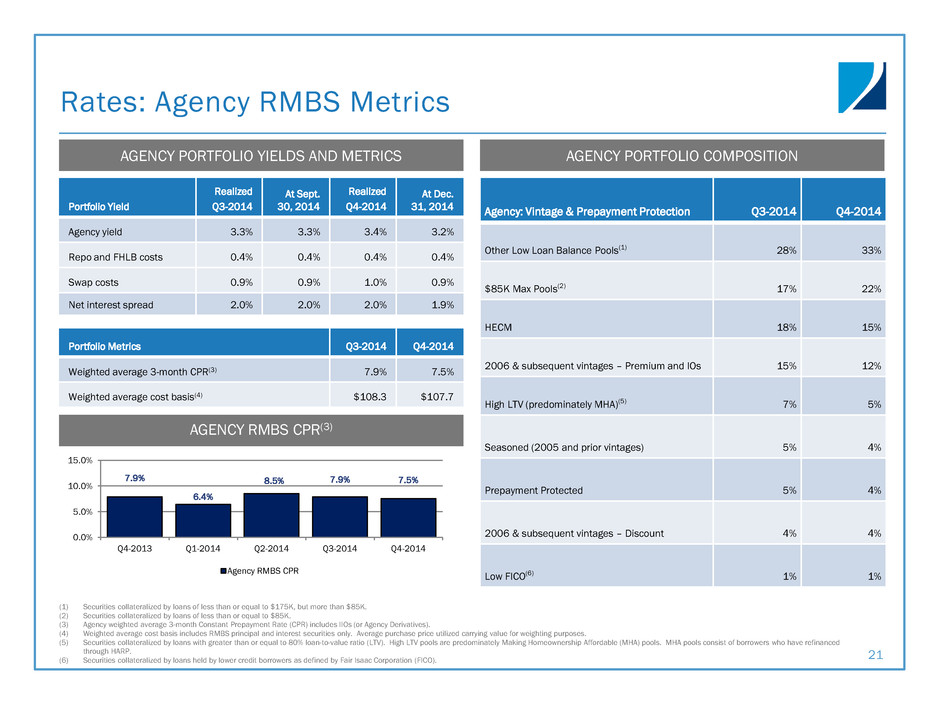 GAAP to Core Earnings Reconciliation 20 (In thousands, except for per share data) Three Months Ended December 31, 2014 Year-Ended December 31, 2014 Reconciliation of GAAP to non-GAAP Information Core Earnings: Net (loss) income $(36,963) $167,139 Adjustments for non-core earnings: Gain on sale of securities and mortgage loans, net of tax (30,447) (95,175) Unrealized gain on trading securities, equity securities and mortgage loans held-for-sale, net of tax (3,983) (1,191) Other-than-temporary impairment loss 180 392 Realized loss on termination or expiration of swaps and swaptions, net of tax 8,458 42,938 Unrealized loss on interest rate swaps and swaptions economically hedging investment portfolio, repurchase agreements and FHLB advances, net of tax 103,239 157,972 Loss on other derivative instruments, net of tax 6,028 20,113 Realized and unrealized loss (gain) on financing securitizations, net of tax 2,129 (16,854) Unrealized loss on mortgage servicing rights, net of tax 36,978 64,320 Securitization deal costs, net of tax 834 3,015 Income from discontinued operations — — Amortization of business combination intangible assets, net of tax — 346 Change in representation and warranty reserve, net of tax (3,345) 793 Core Earnings $83,108 $343,808 Weighted average shares outstanding – Diluted 366,230,566 366,011,855 Core Earnings per weighted average share outstanding – Diluted $0.23 $0.94
