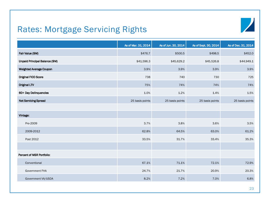 Rates: Mortgage Servicing Rights 23 As of Mar. 31, 2014 As of Jun. 30, 2014 As of Sept. 30, 2014 As of Dec. 31, 2014 Fair Value ($M) $476.7 $500.5 $498.5 $452.0 Unpaid Principal Balance ($M) $41,596.3 $45,629.2 $45,526.8 $44,949.1 Weighted Average Coupon 3.9% 3.9% 3.9% 3.9% Original FICO Score 738 740 730 725 Original LTV 75% 74% 74% 74% 60+ Day Delinquencies 1.0% 1.2% 1.4% 1.5% Net Servicing Spread 25 basis points 25 basis points 25 basis points 25 basis points Vintage: Pre-2009 3.7% 3.8% 3.6% 3.5% 2009-2012 62.8% 64.5% 63.0% 61.2% Post 2012 33.5% 31.7% 33.4% 35.3% Percent of MSR Portfolio: Conventional 67.1% 71.1% 72.1% 72.9% Government FHA 24.7% 21.7% 20.9% 20.3% Government VA/USDA 8.2% 7.2% 7.0% 6.8%