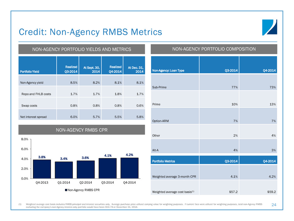 Credit: Non-Agency RMBS Metrics 24 NON-AGENCY PORTFOLIO COMPOSITION NON-AGENCY PORTFOLIO YIELDS AND METRICS (1) Weighted average cost basis includes RMBS principal and interest securities only. Average purchase price utilized carrying value for weighting purposes. If current face were utilized for weighting purposes, total non-Agency RMBS excluding the company’s non-Agency interest-only portfolio would have been $54.78 at December 31, 2014. Portfolio Yield Realized Q3-2014 At Sept. 30, 2014 Realized Q4-2014 At Dec. 31, 2014 Non-Agency yield 8.5% 8.2% 8.1% 8.1% Repo and FHLB costs 1.7% 1.7% 1.8% 1.7% Swap costs 0.8% 0.8% 0.8% 0.6% Net interest spread 6.0% 5.7% 5.5% 5.8% NON-AGENCY RMBS CPR Non-Agency: Loan Type Q3-2014 Q4-2014 Sub-Prime 77% 73% Prime 10% 13% Option-ARM 7% 7% Other 2% 4% Alt-A 4% 3% Portfolio Metrics Q3-2014 Q4-2014 Weighted average 3-month CPR 4.1% 4.2% Weighted average cost basis(1) $57.2 $59.2 3.8% 3.4% 3.6% 4.1% 4.2% 0.0% 2.0% 4.0% 6.0% 8.0% Q4-2013 Q1-2014 Q2-2014 Q3-2014 Q4-2014 Non-Agency RMBS CPR