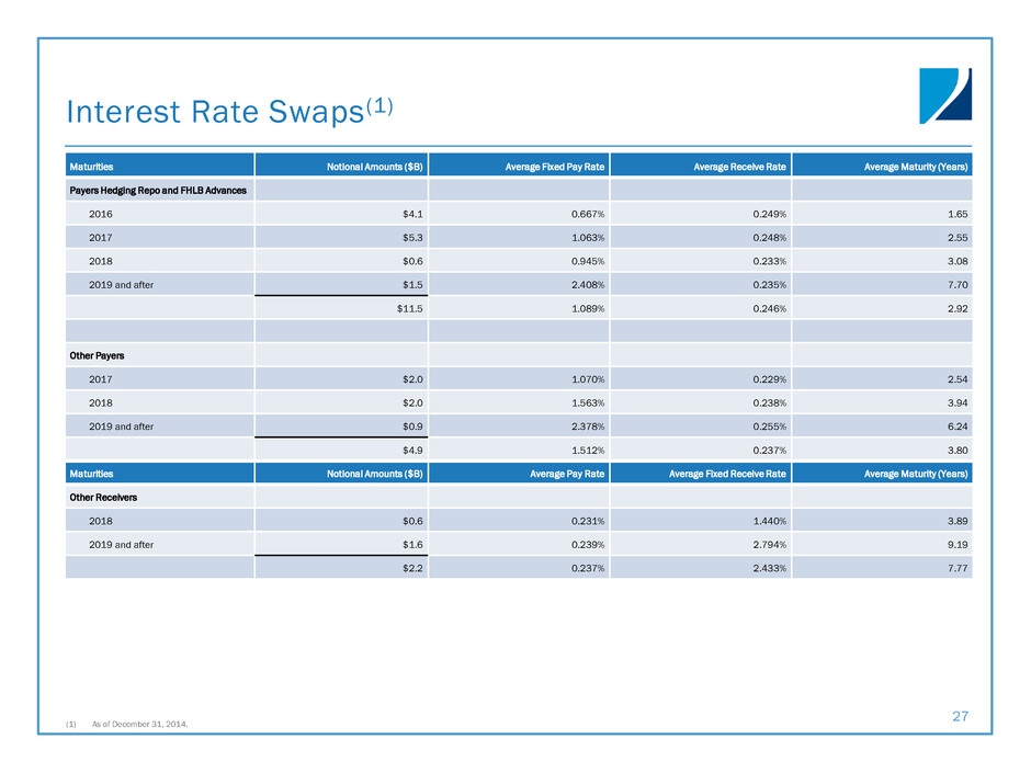 Maturities Notional Amounts ($B) Average Fixed Pay Rate Average Receive Rate Average Maturity (Years) Payers Hedging Repo and FHLB Advances 2016 $4.1 0.667% 0.249% 1.65 2017 $5.3 1.063% 0.248% 2.55 2018 $0.6 0.945% 0.233% 3.08 2019 and after $1.5 2.408% 0.235% 7.70 $11.5 1.089% 0.246% 2.92 Other Payers 2017 $2.0 1.070% 0.229% 2.54 2018 $2.0 1.563% 0.238% 3.94 2019 and after $0.9 2.378% 0.255% 6.24 $4.9 1.512% 0.237% 3.80 Maturities Notional Amounts ($B) Average Pay Rate Average Fixed Receive Rate Average Maturity (Years) Other Receivers 2018 $0.6 0.231% 1.440% 3.89 2019 and after $1.6 0.239% 2.794% 9.19 $2.2 0.237% 2.433% 7.77 Interest Rate Swaps(1) 27 (1) As of December 31, 2014.
